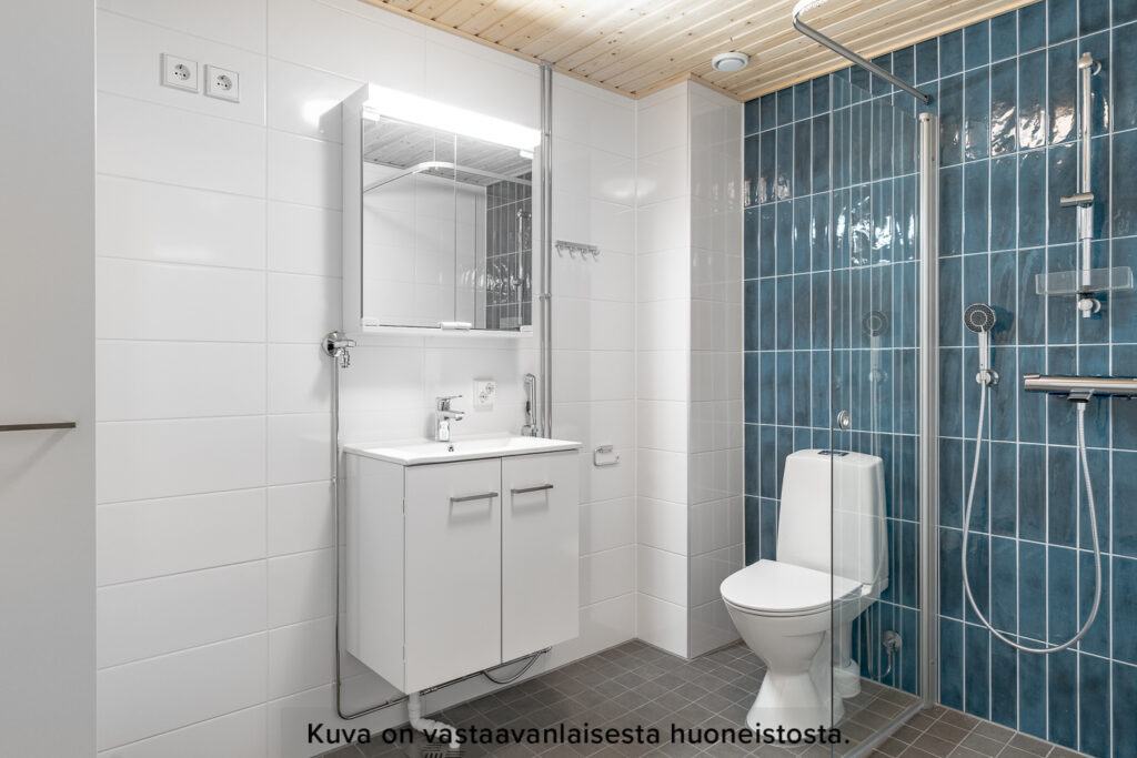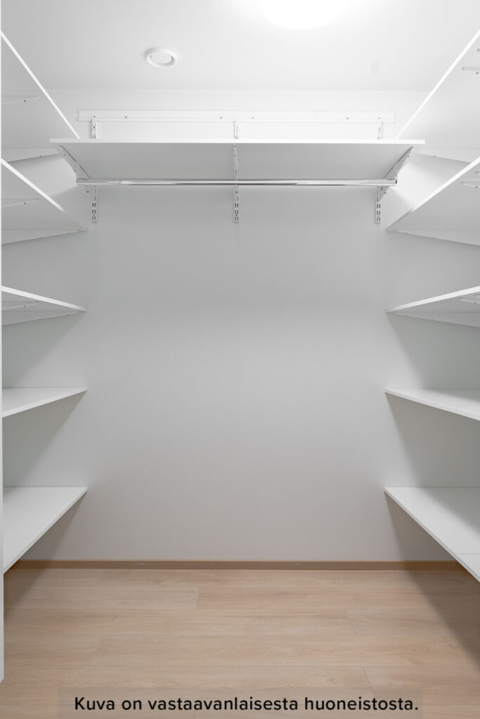Asunnossa on mukavasti säilytystilaa. Eteisen yhteydessä on mm. iso vaatehuone. Kylpyhuoneessa on paikka pyykinpesukoneelle ja kuivausrummulle sekä säilytystilaa peili- ja allas-, ja pyykkikaapeissa. Suihkunurkkauksessa on kätevästi kääntyvä suihkuseinäke.