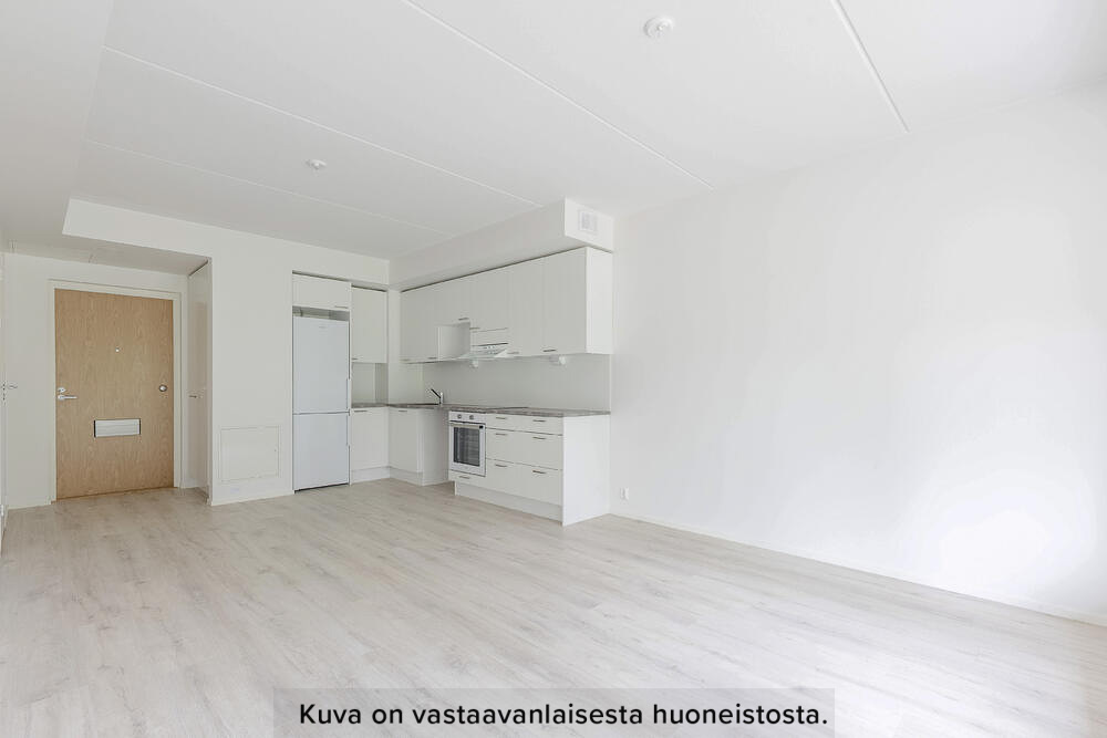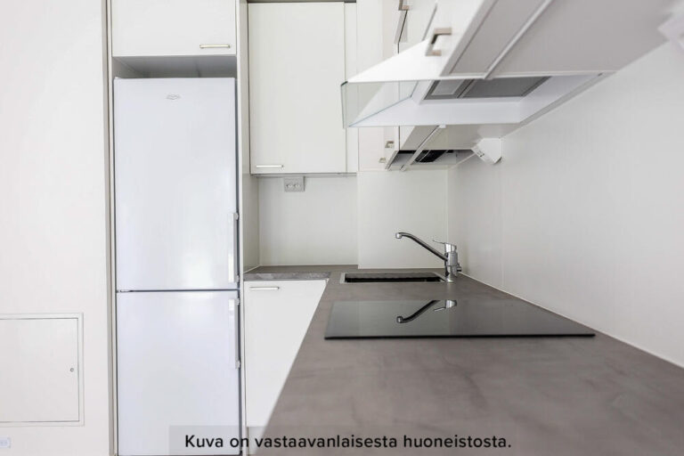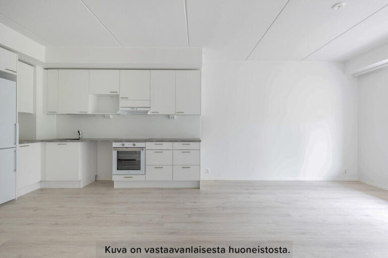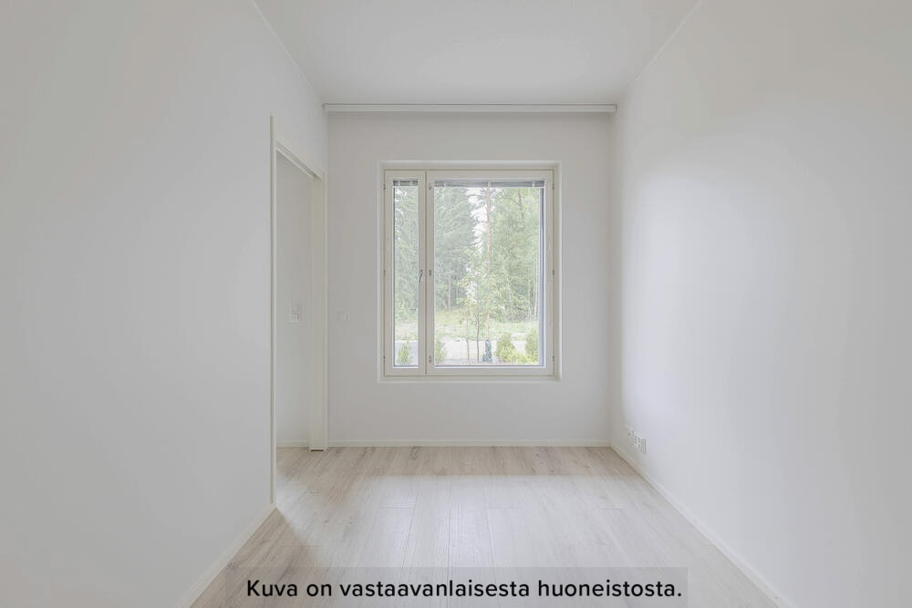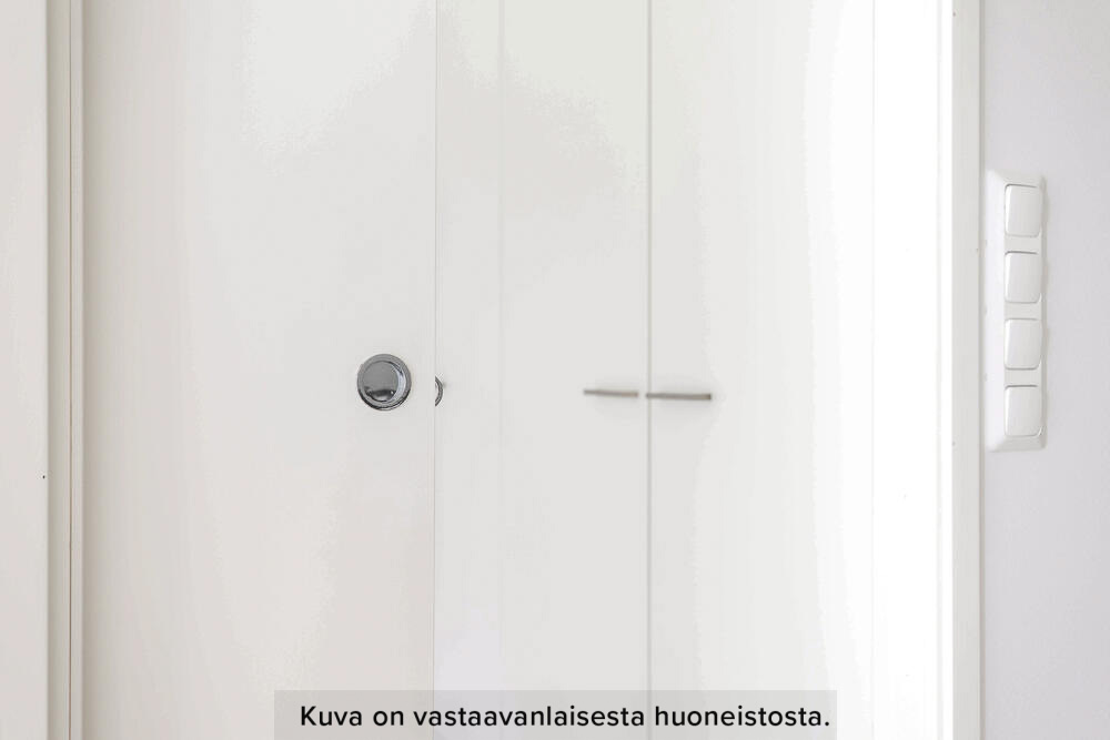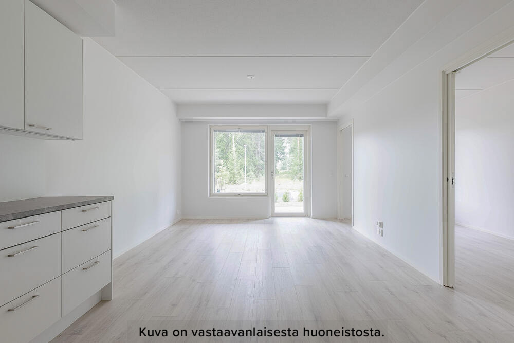 Tässä kaksiossa keittiö avautuu luontevasti olohuoneeseen, josta käynti omalle parvekkeelle. Keittiöstä löytyy varaus astianpesukoneelle. Erillinen makuuhuone, jossa sopivasti kaappitilaa. Lattiat ovat laminaattia, seinät valkoiseksi maalattu. Laatoitettu pesuhuone, jonne mahtuu hyvin pyykinpesukone.