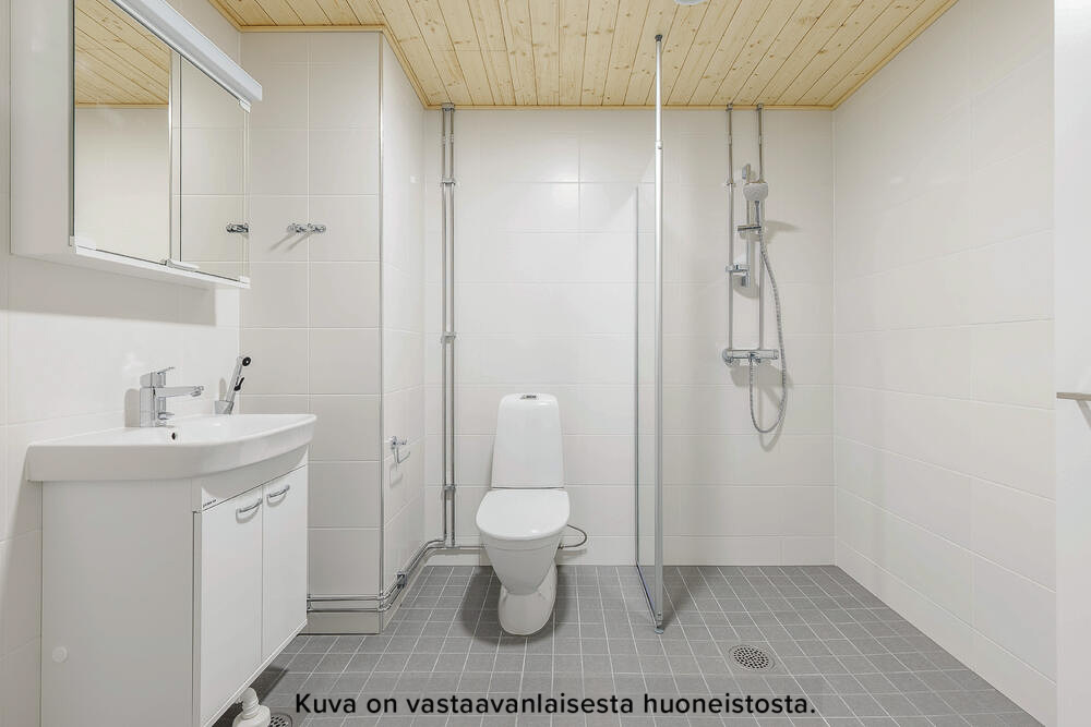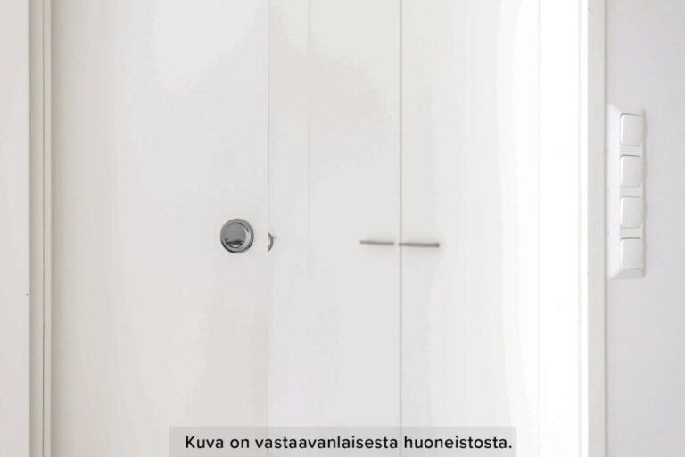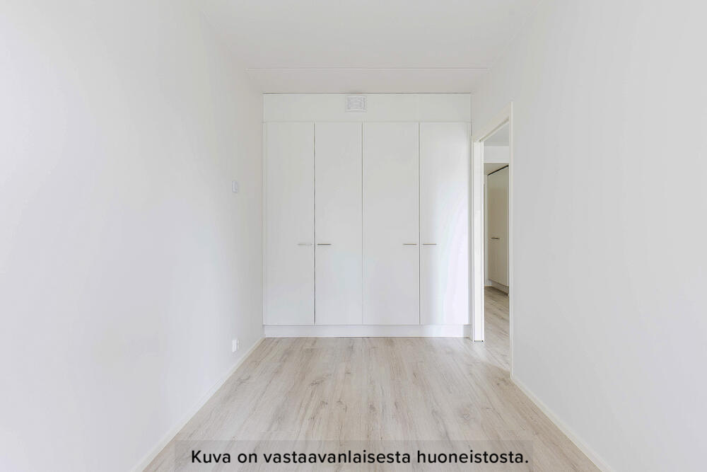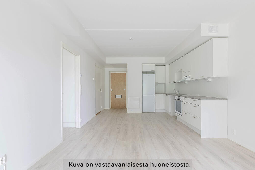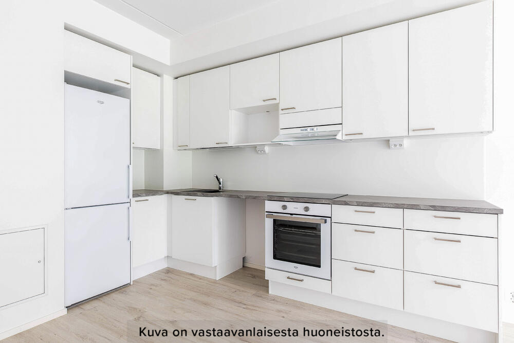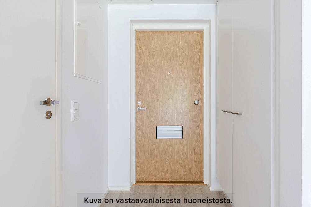 Tässä kaksiossa keittiö avautuu luontevasti olohuoneeseen, josta käynti omalle parvekkeelle. Keittiöstä löytyy varaus astianpesukoneelle. Erillinen makuuhuone, jossa sopivasti kaappitilaa. Lattiat ovat laminaattia, seinät valkoiseksi maalattu. Laatoitettu pesuhuone, jonne mahtuu hyvin pyykinpesukone.