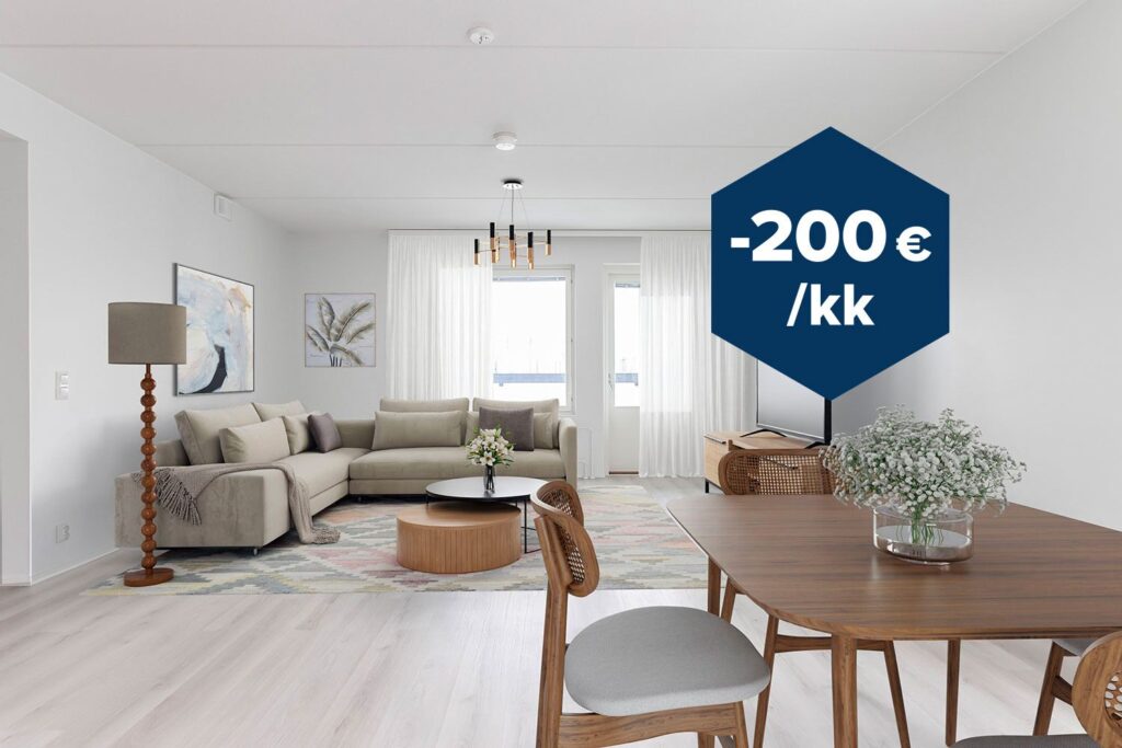 Kampanjaetu uusille asiakkaille! Saat 200 € alennuksen tämän asunnon kuukausittaisesta käyttövastikkeesta vuoden 2026 loppuun asti. Etu koskee uusia sopimuksia, jotka allekirjoitetaan viimeistään 31.5.2026. Alennus myönnetään kuukausilta, joilta käyttövastiketta kertyy vähintään 15 päivältä. Lue tarkemmat kampanjaehdot.