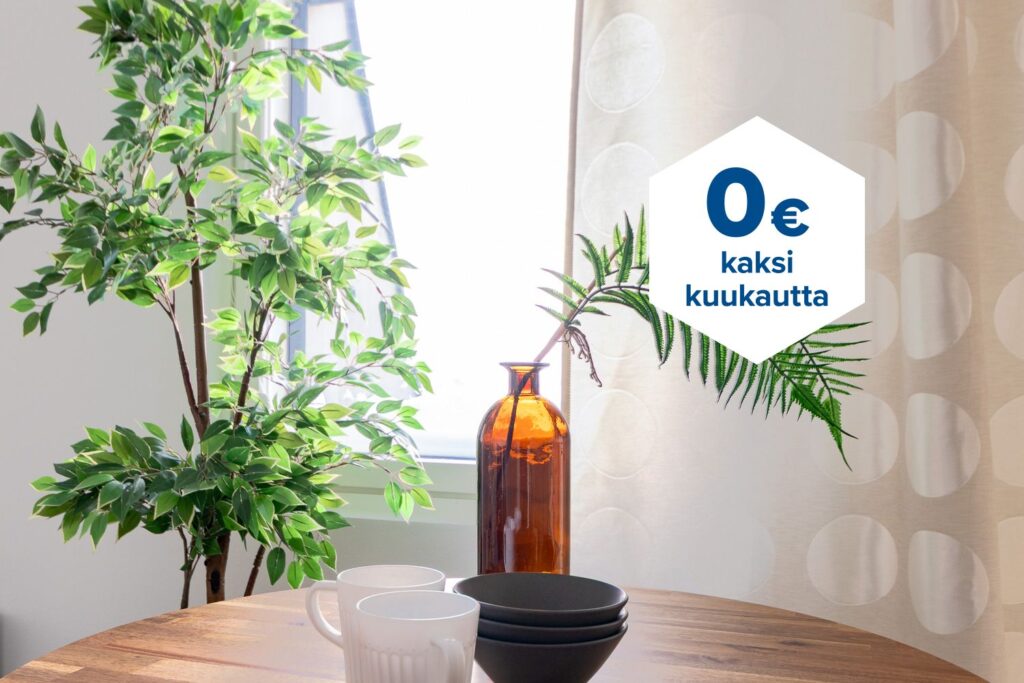 Tee sopimus nyt – saat kahden ensimmäisen kuukauden käyttövastikkeen hintaan 0 € ja vakuusmaksun 250 €. Edut ovat voimassa 15.4.2026 saakka ja koskevat vain uusia asiakkaita. Vesi- ja autopaikkamaksut normaalisti. Edellyttää 12 kuukauden asumista.