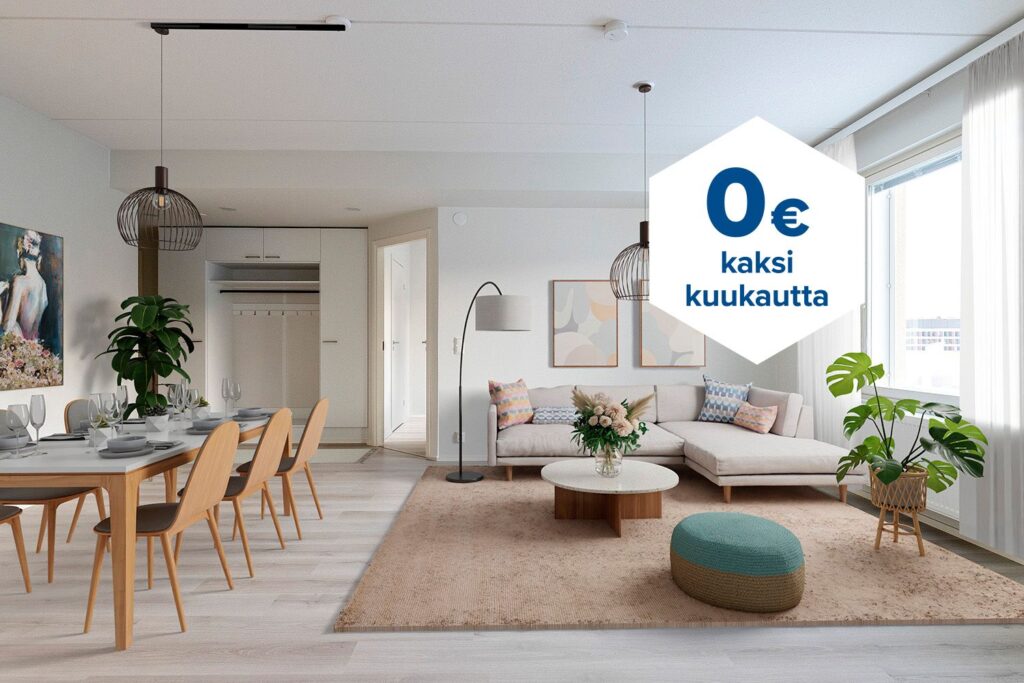 Tee sopimus nyt – saat kahden ensimmäisen kuukauden käyttövastikkeen hintaan 0 € ja vakuusmaksun 250 €. Edut ovat voimassa 15.4.2026 saakka ja koskevat vain uusia asiakkaita. Vesi- ja autopaikkamaksut normaalisti. Edellyttää 12 kuukauden asumista.