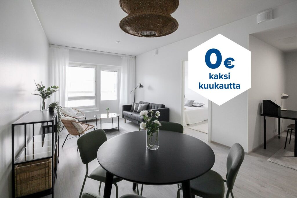 Tee sopimus nyt – saat kahden ensimmäisen kuukauden käyttövastikkeen hintaan 0 €. Edut ovat voimassa 15.4.2026 saakka ja koskevat vain uusia asiakkaita. Vesi- ja autopaikkamaksut normaalisti. Edellyttää 12 kuukauden asumista.