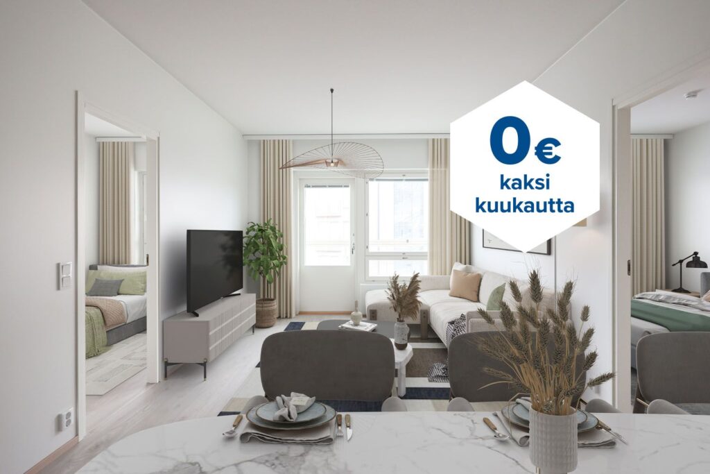 Tee sopimus nyt – saat kahden ensimmäisen kuukauden käyttövastikkeen hintaan 0 €. Edut ovat voimassa 15.4.2026 saakka ja koskevat vain uusia asiakkaita. Vesi- ja autopaikkamaksut normaalisti. Edellyttää 12 kuukauden asumista.