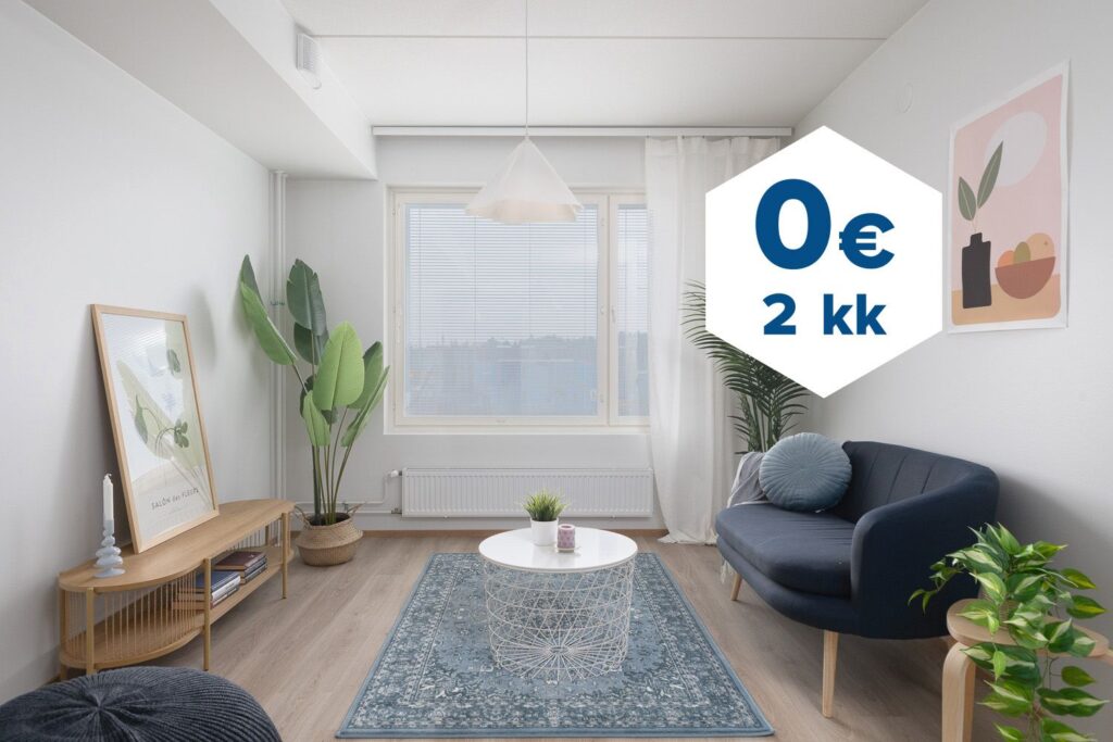 Tee sopimus nyt – saat kahden ensimmäisen kuukauden käyttövastikkeen hintaan 0 € ja vakuusmaksun 250 €. Uuden asukkaan edut ovat voimassa 15.4.2026 mennessä tehtyihin sopimuksiin ja koskevat heti vapaita asuntoja. Vesi- ja autopaikkamaksut normaalisti. Edellyttää 12 kuukauden asumista. Lue lisää kampanjaedusta.