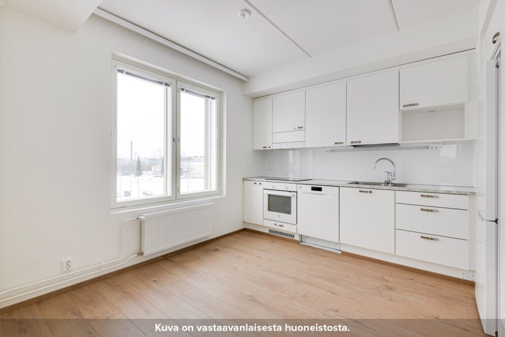Keittiössä ala- ja yläkaappien väliset taustaseinät ovat levypintaisia, työpöytätasot laminaattia ja allas puolestaan ruostumatonta terästä. Keittiössä on lisäksi induktiokeittotasolla varustettu kalusteuuni, astianpesukone sekä tilavaraus mikroaaltouunille.