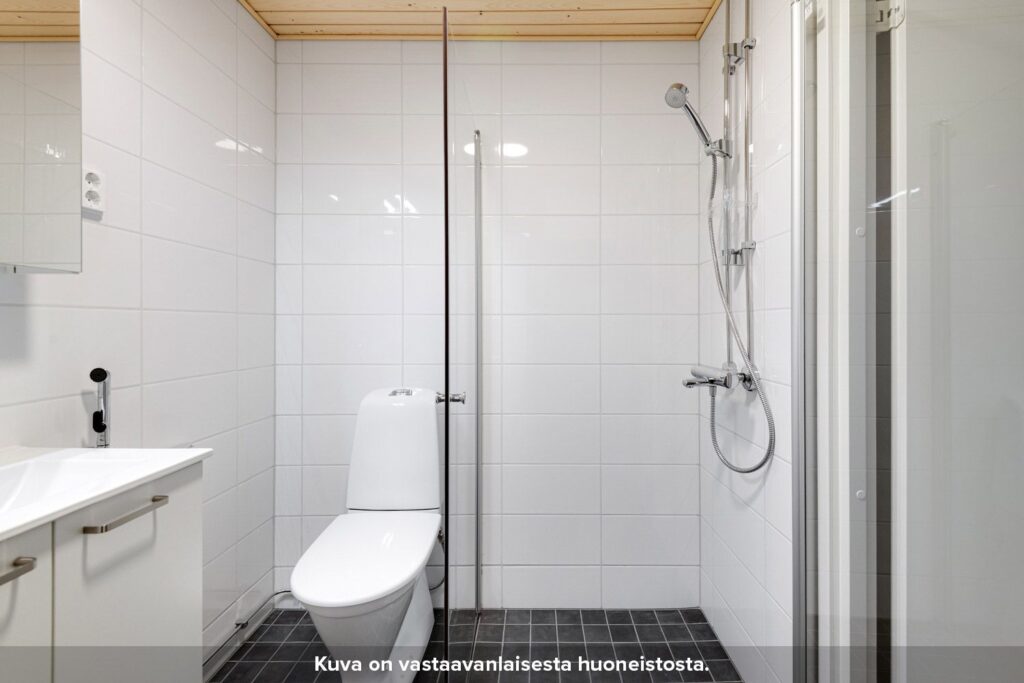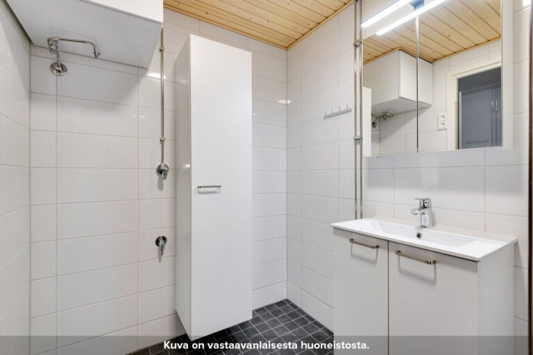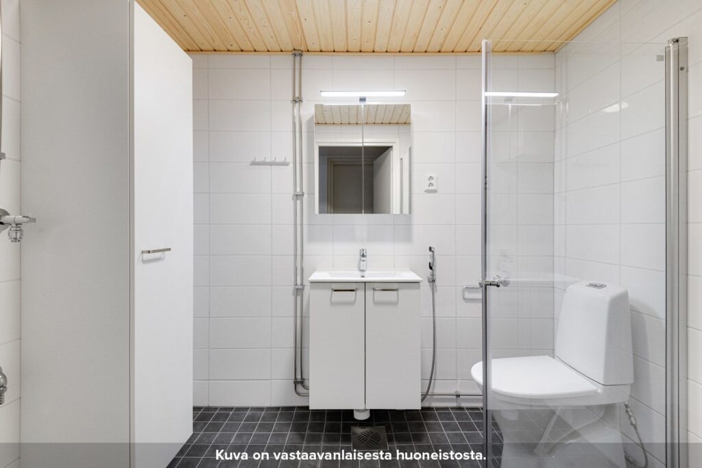 Kylpyhuoneen seinät on laatoitettu ja lattioissa on keraaminen laatta. Suihkussa on näppärästi kääntyvä suihkuseinä. Lisäksi kylpyhuoneessa on peilikaappi, jossa on pistorasia ja valaisin, allaskaappi pesualtaiden alla sekä liitos- ja tilavaraukset pyykinpesukoneelle tai pesutornille.