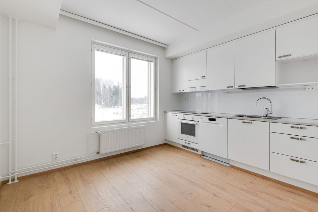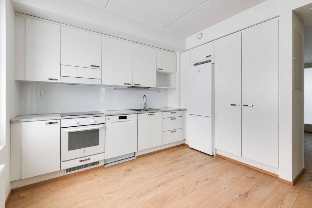 Asuntoon astutaan sisään oman kuistin kautta, ja erillinen eteiskäytävä johdattelee asuntoon. Asunnossa on tilava kulmakeittiö. Keittiössä ala- ja yläkaappien väliset taustaseinät ovat levypintaisia, työpöytätasot laminaattia ja allas puolestaan ruostumatonta terästä. Keittiössä on lisäksi induktiokeittotasolla varustettu kalusteuuni, astianpesukone sekä tilavaraus mikroaaltouunille.