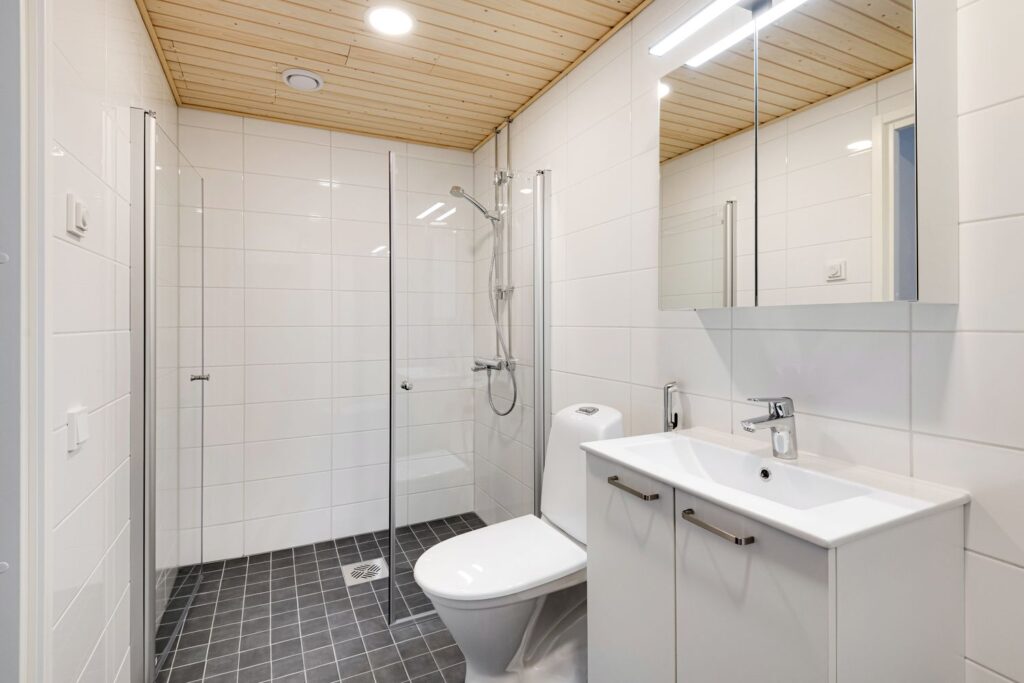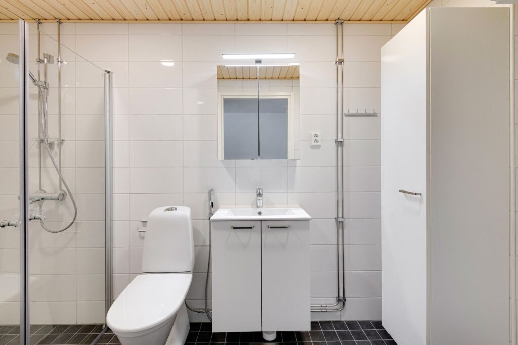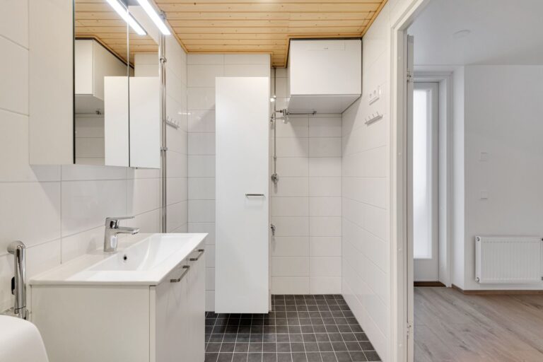 Kylpyhuone löytyy asunnon eteisen yhteydestä. Kylpyhuoneen seinät on laatoitettu ja lattioissa on keraaminen laatta. Suihkussa on näppärästi kääntyvä suihkuseinä. Lisäksi kylpyhuoneessa on peilikaappi, jossa on pistorasia ja valaisin, allaskaappi pesualtaiden alla sekä liitos- ja tilavaraukset pyykinpesukoneelle tai pesutornille.
