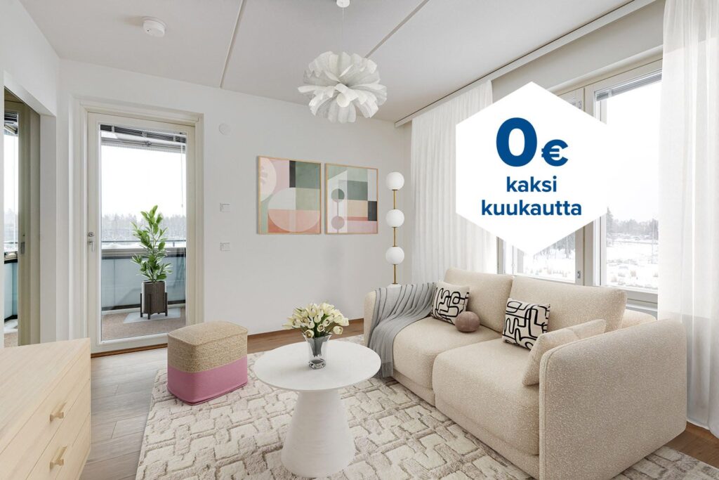 Tee sopimus nyt – saat kahden ensimmäisen kuukauden käyttövastikkeen hintaan 0 € ja vakuusmaksun 250 €. Edut ovat voimassa 15.4.2026 saakka ja koskevat vain vapaita asuntoja ja uusia asiakkaita. Vesi- ja autopaikkamaksut normaalisti. Edellyttää 12 kuukauden asumista.