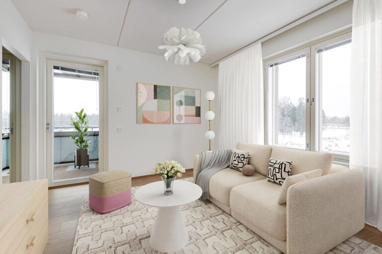 Olohuone on sijoitettu erilliseen tilaan, jonne pääsee keittiöstä sekä makuuhuoneesta liukuovien kautta. Keittiön ja olohuoneen pohjaratkaisu mahdollistaa sen, että asunto sopii hyvin myös esimerkiksi kämppisasumiseen. Asunnon tilavassa makuuhuoneessa on valmiina säilytystilaa. Kompaktille lasitetulle parvekkeelle pääsee kulkemaan niin olohuoneesta kuin makuuhuoneestakin.