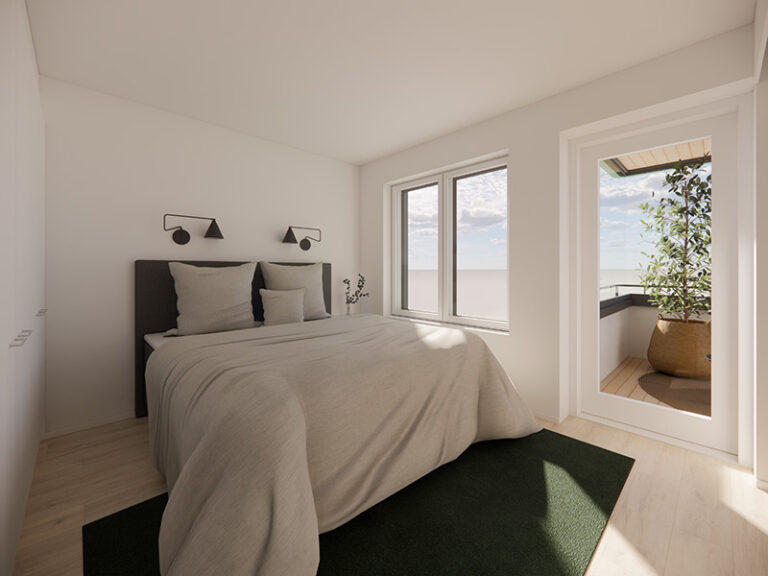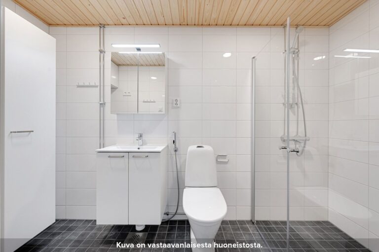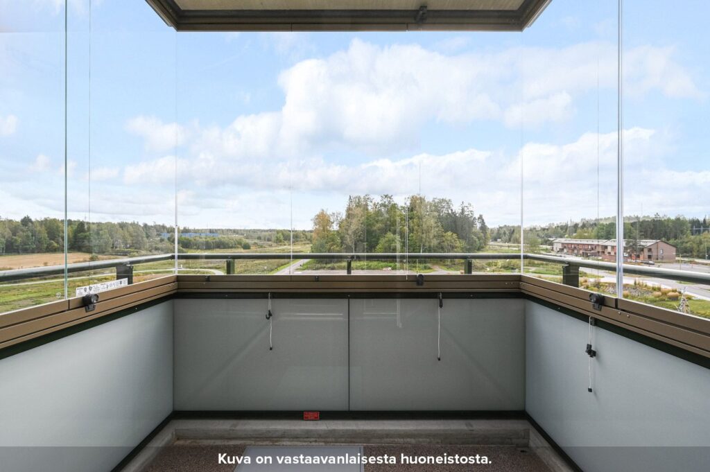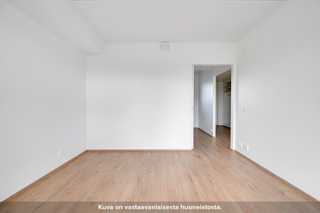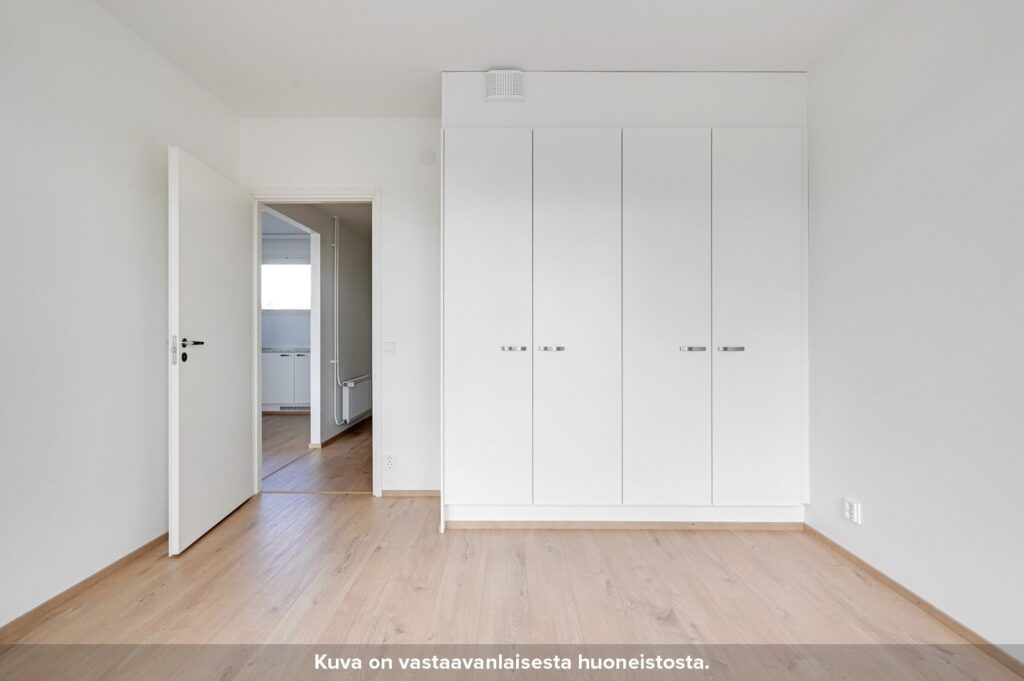 Asunnon tilavassa makuuhuoneessa on valmiina säilytystilaa. Asunnon kompaktille lasitetulle parvekkeelle pääsee kulkemaan niin olohuoneesta kuin makuuhuoneestakin. Parvekkeen jatkeena toimii oma tilava terassi. Kylpyhuone löytyy asunnon eteisen yhteydestä. Kylpyhuoneen seinät on laatoitettu ja lattioissa on keraaminen laatta. Suihkussa on näppärästi kääntyvä suihkuseinä. Lisäksi kylpyhuoneessa on peilikaappi, jossa on pistorasia ja valaisin, allaskaappi pesualtaiden alla sekä liitos- ja tilavaraukset pyykinpesukoneelle tai pesutornille.