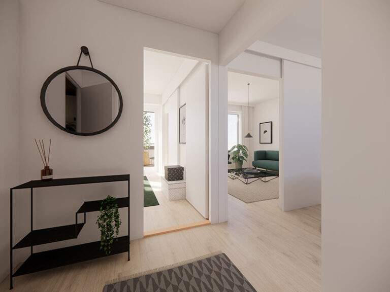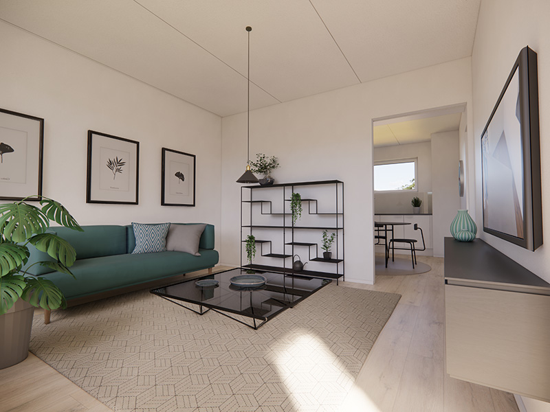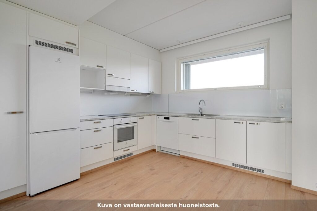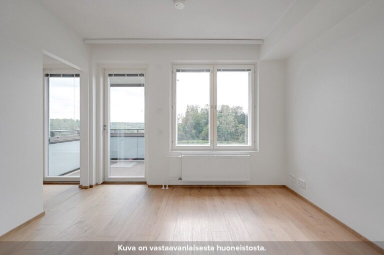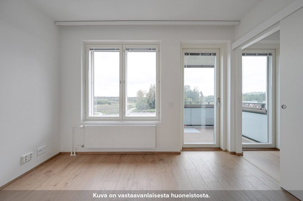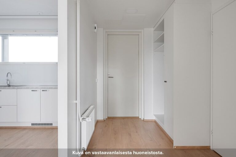 Neljännen kerroksen toimiva kaksio. Erillinen eteiskäytävä johdattelee asuntoon sisään. Asunnossa on tilava kulmakeittiö, jonka ala- ja yläkaappien väliset taustaseinät ovat levypintaisia. Keittiön työpöytätasot ovat laminaattia ja allas puolestaan ruostumatonta terästä. Keittiössä on lisäksi induktiokeittotasolla varustettu kalusteuuni, astianpesukone sekä tilavaraus mikroaaltouunille. Olohuone on sijoitettu erilliseen tilaan, jonne pääsee keittiöstä sekä makuuhuoneesta liukuovien kautta. Keittiön ja olohuoneen pohjaratkaisu mahdollistaa sen, että asunto sopii hyvin myös esimerkiksi kämppisasumiseen.