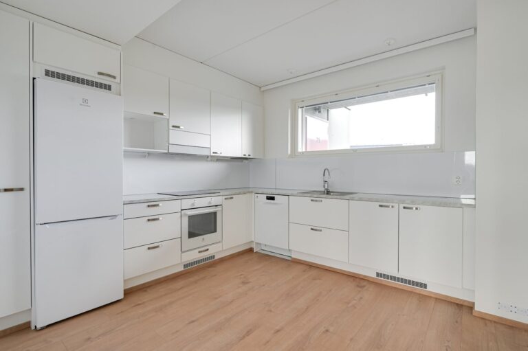Erillinen eteiskäytävä johdattelee tähän viihtyisään läpitalon asuntoon, jossa on tilava kulmakeittiö. Keittiön ala- ja yläkaappien väliset taustaseinät ovat levypintaisia, työpöytätasot laminaattia ja allas puolestaan ruostumatonta terästä. Keittiössä on lisäksi induktiokeittotasolla varustettu kalusteuuni, astianpesukone sekä tilavaraus mikroaaltouunille.