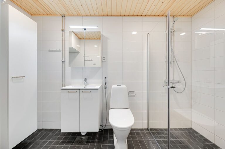 Kylpyhuone löytyy asunnon eteisen yhteydestä. Kylpyhuoneen seinät on laatoitettu ja lattioissa on keraaminen laatta. Suihkussa on näppärästi kääntyvä suihkuseinä. Lisäksi kylpyhuoneessa on peilikaappi, jossa on pistorasia ja valaisin, allaskaappi pesualtaiden alla sekä liitos- ja tilavaraukset pyykinpesukoneelle tai pesutornille.