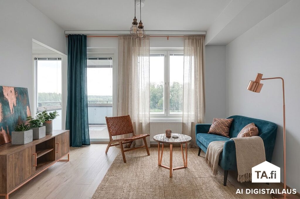 Olohuone on sijoitettu erilliseen tilaan, jonne pääsee keittiöstä sekä makuuhuoneesta liukuovien kautta. Keittiön ja olohuoneen pohjaratkaisu mahdollistaa sen, että asunto sopii hyvin myös esimerkiksi kämppisasumiseen. Asunnon tilavassa makuuhuoneessa on valmiina säilytystilaa. Kompaktille lasitetulle parvekkeelle pääsee kulkemaan niin olohuoneesta kuin makuuhuoneestakin.