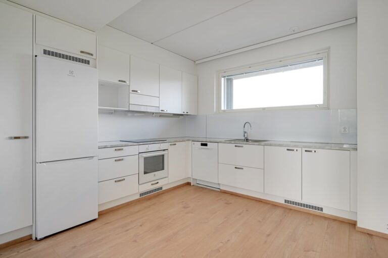 Erillinen eteiskäytävä johdattelee sisään tähän tilavaan läpitalon asuntoon. Asunnossa on tilava kulmakeittiö. Keittiössä ala- ja yläkaappien väliset taustaseinät ovat levypintaisia, työpöytätasot laminaattia ja allas puolestaan ruostumatonta terästä. Keittiössä on lisäksi induktiokeittotasolla varustettu kalusteuuni, astianpesukone sekä tilavaraus mikroaaltouunille.