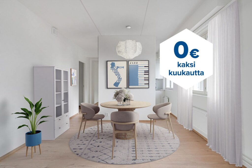 Tee sopimus nyt – saat kahden ensimmäisen kuukauden käyttövastikkeen hintaan 0 € ja vakuusmaksun 250 €. Edut ovat voimassa 15.4.2026 saakka ja koskevat vain vapaita asuntoja ja uusia asiakkaita. Vesi- ja autopaikkamaksut normaalisti. Edellyttää 12 kuukauden asumista.