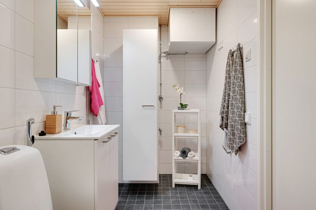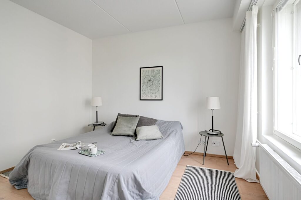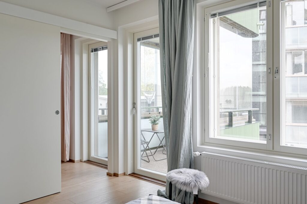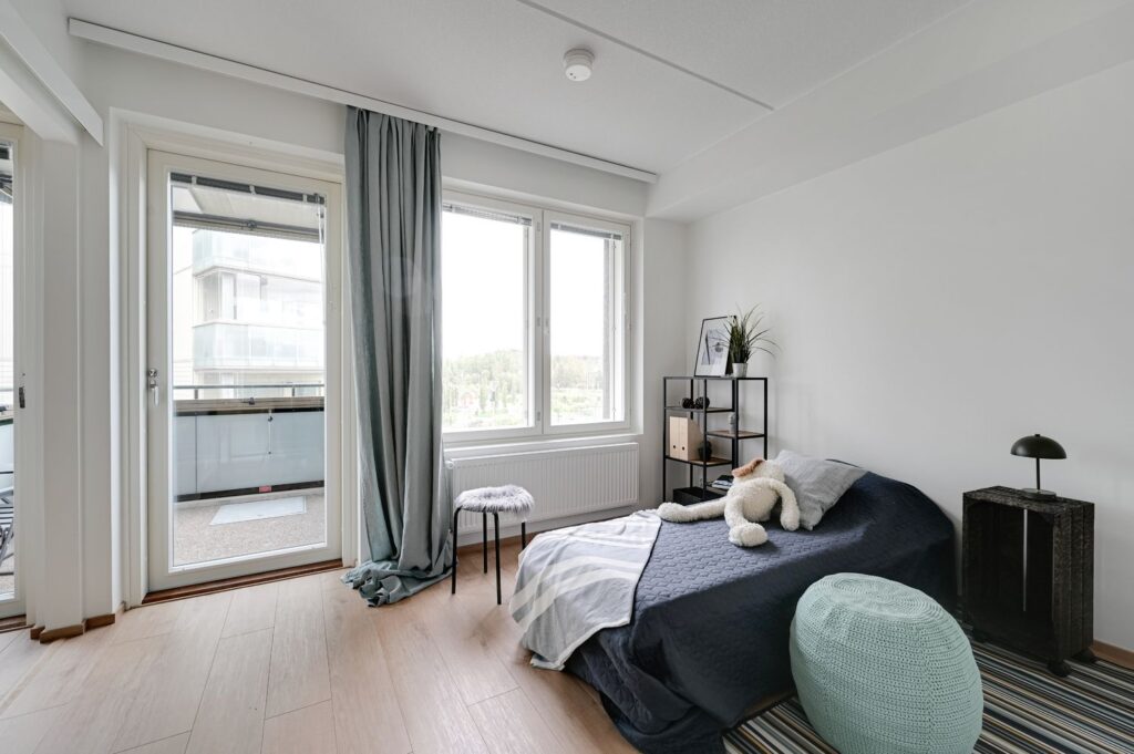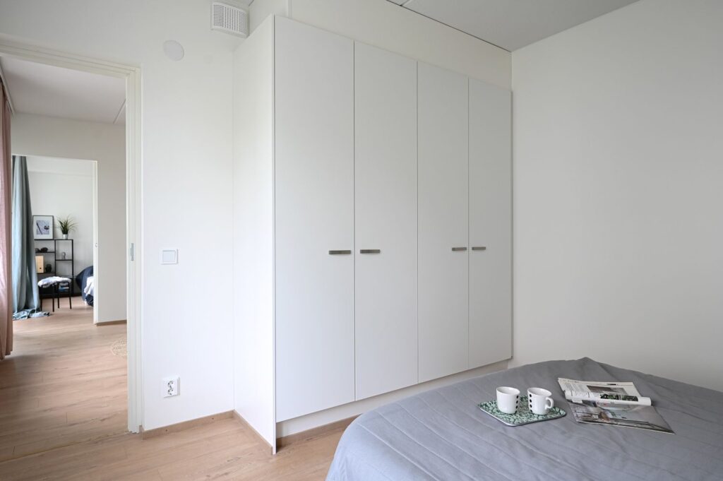Asunnossa on kaksi tilavaa makuuhuonetta, joissa on kaappitilaa. Asunnon kompaktille lasitetulle parvekkeelle pääsee kulkemaan niin olohuoneesta kuin toisesta makuuhuoneestakin. Kylpyhuone löytyy eteisen yhteydestä. Kylpyhuoneen seinät on laatoitettu ja lattioissa on keraaminen laatta. Suihkussa on näppärästi kääntyvä suihkuseinä. Lisäksi kylpyhuoneessa on peilikaappi, jossa on pistorasia ja valaisin, allaskaappi pesualtaiden alla sekä liitos- ja tilavaraukset pyykinpesukoneelle tai pesutornille.