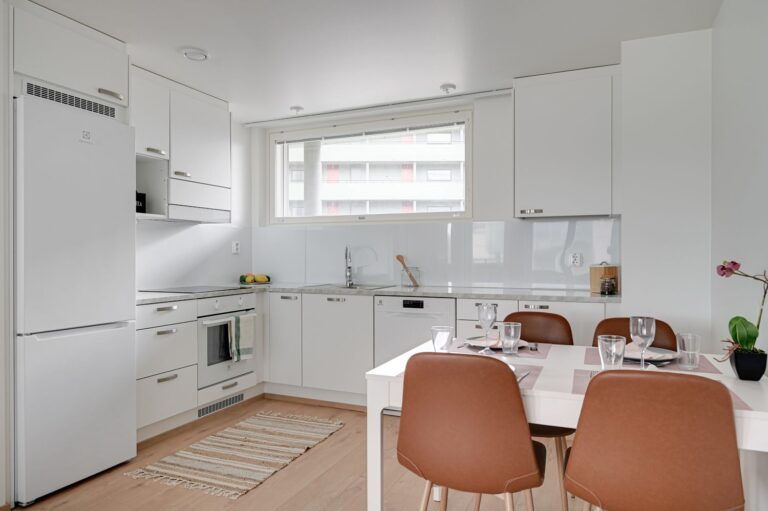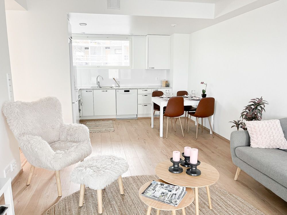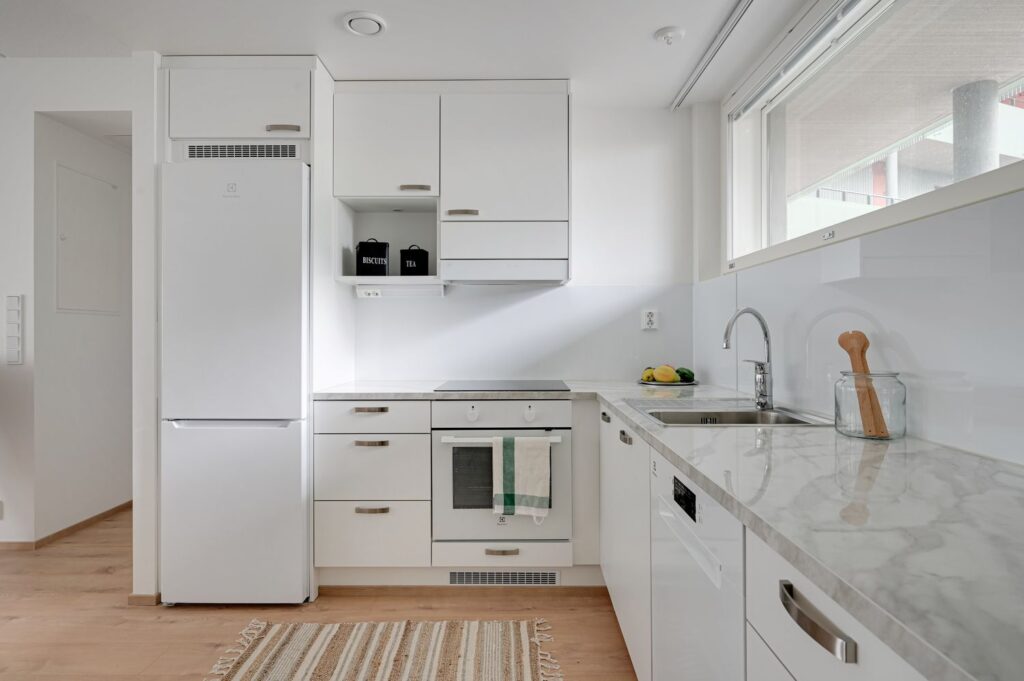 Erillinen eteiskäytävä johdattelee tähän viihtyisään uuteen asuntoon. Keittiö ja olohuone on sijoitettu yhteen toimivaan tilaan, jossa ajanvietto perheen kanssa on helppoa. Keittiössä ala- ja yläkaappien väliset taustaseinät ovat levypintaisia, työpöytätasot laminaattia ja allas puolestaan ruostumatonta terästä. Keittiössä on lisäksi induktiokeittotasolla varustettu kalusteuuni, astianpesukone sekä tilavaraus mikroaaltouunille.