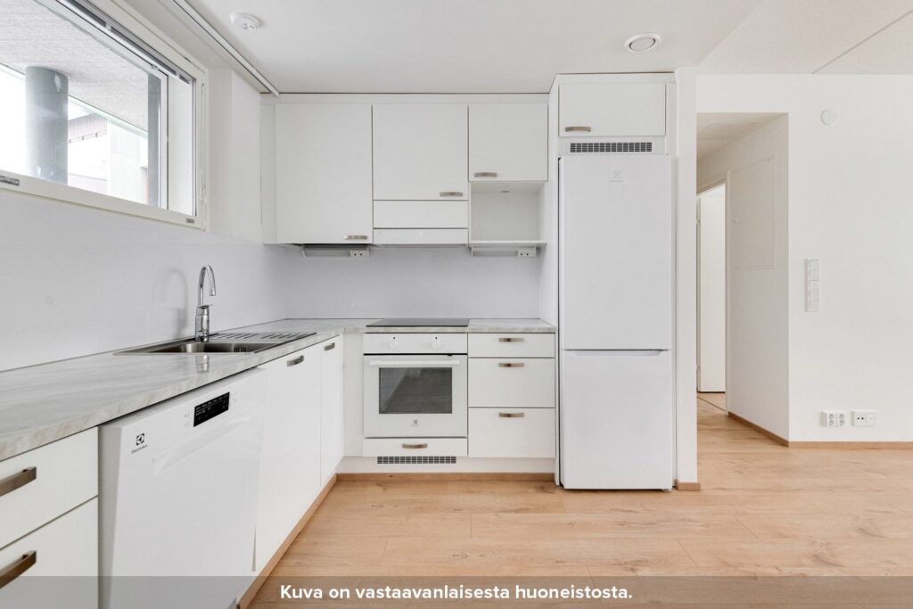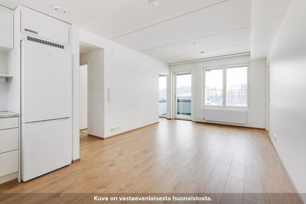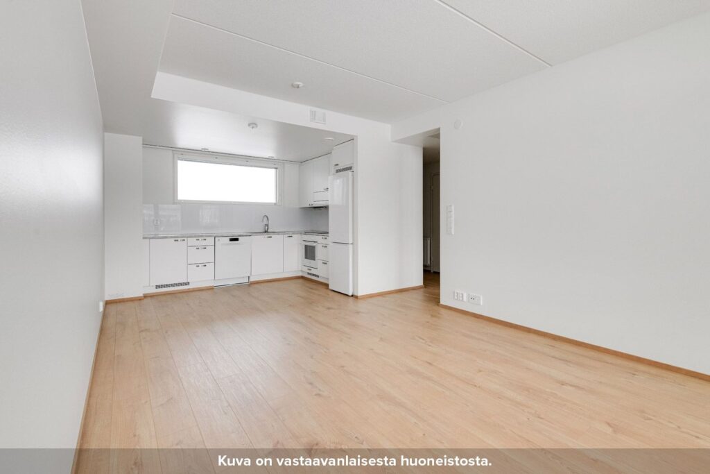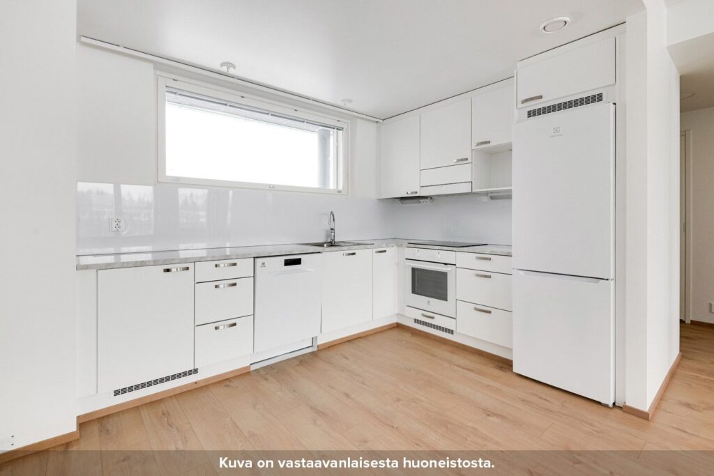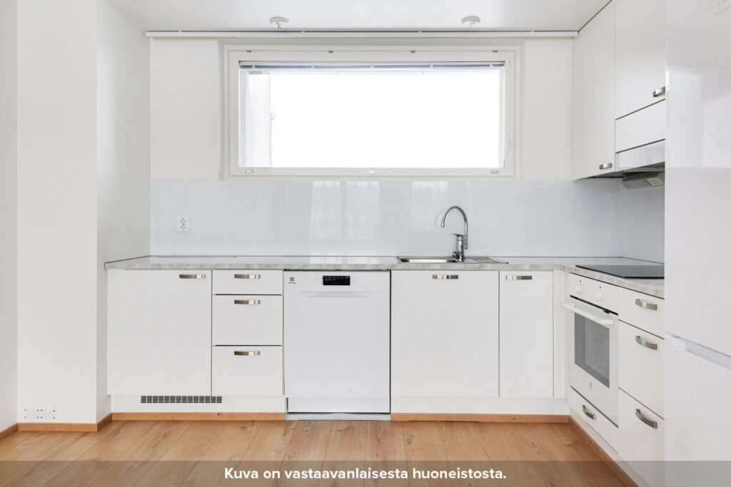 Erillinen eteiskäytävä johdattelee asuntoon. Keittiö ja olohuone on sijoitettu yhteen toimivaan tilaan, jossa ajanvietto perheen kanssa on helppoa. Keittiössä ala- ja yläkaappien väliset taustaseinät ovat levypintaisia, työpöytätasot laminaattia ja allas puolestaan ruostumatonta terästä. Keittiössä on lisäksi induktiokeittotasolla varustettu kalusteuuni, astianpesukone sekä tilavaraus mikroaaltouunille.