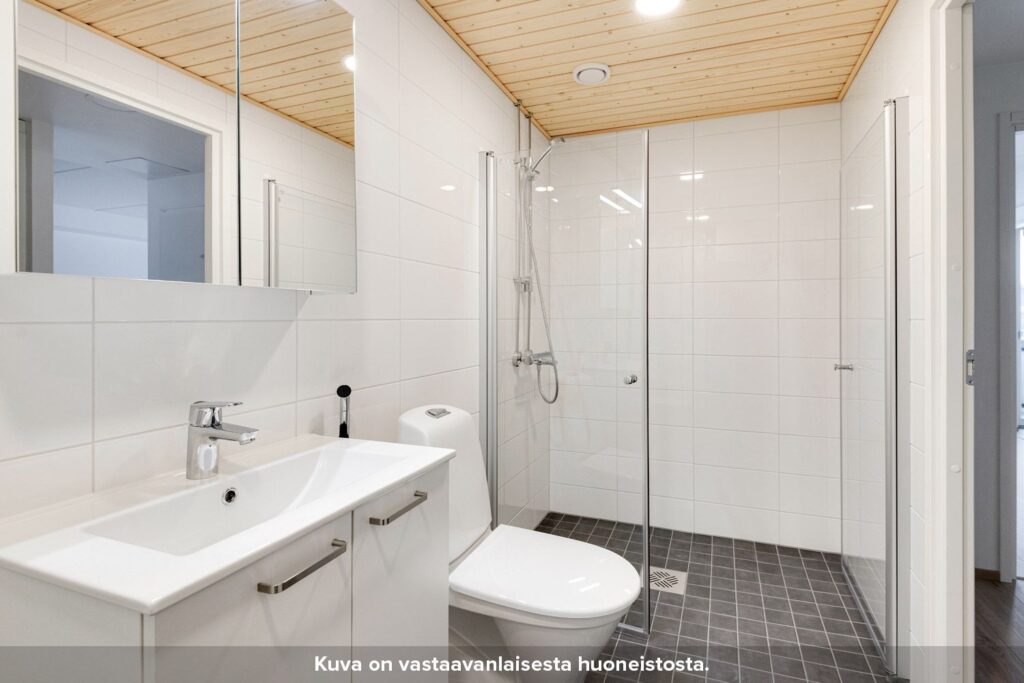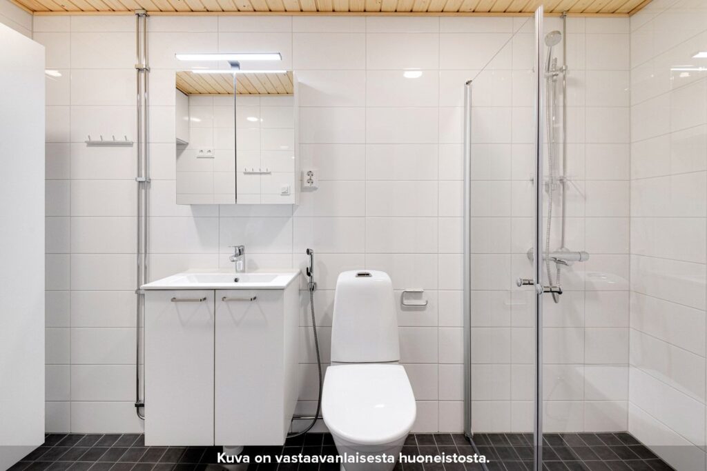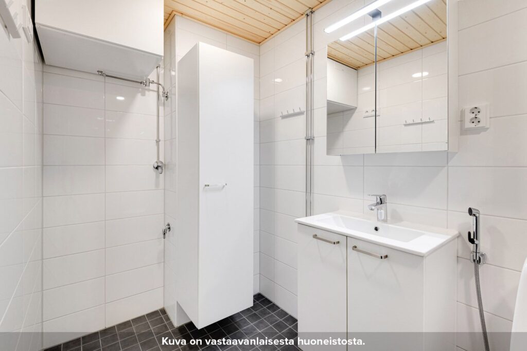 Kylpyhuoneen seinät on laatoitettu ja lattioissa on keraaminen laatta. Suihkussa on näppärästi kääntyvä suihkuseinä. Lisäksi kylpyhuoneessa on peilikaappi, jossa on pistorasia ja valaisin, allaskaappi pesualtaiden alla sekä liitos- ja tilavaraukset pyykinpesukoneelle tai pesutornille.