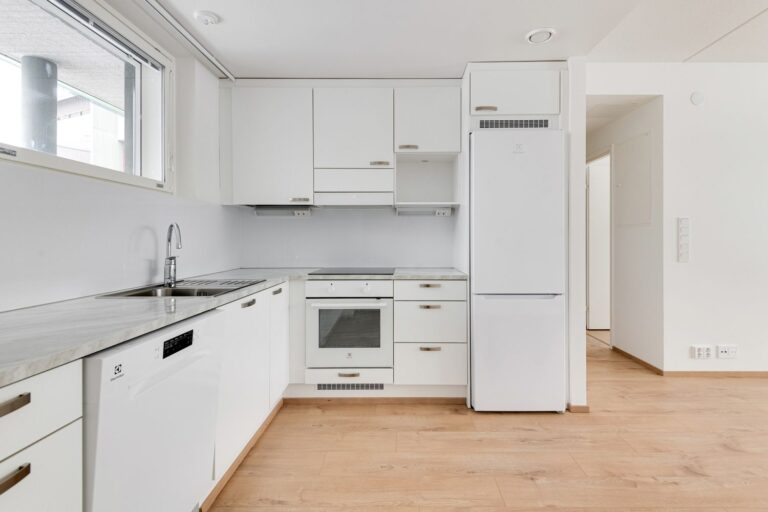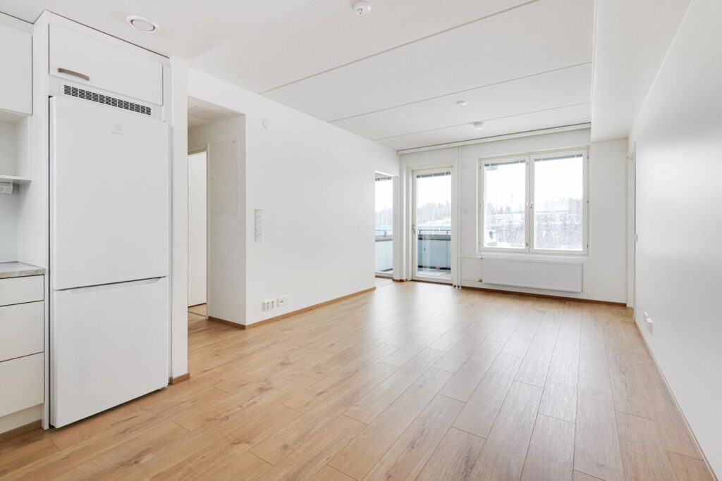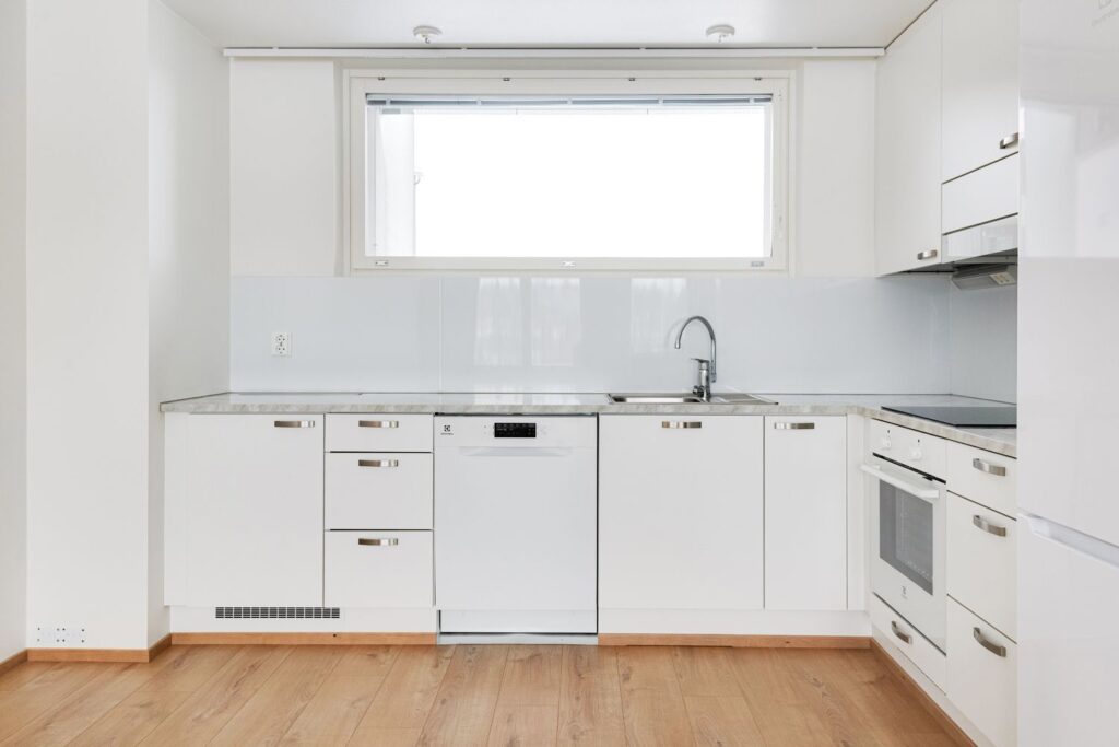 Erillinen eteiskäytävä johdattelee asuntoon. Keittiö ja olohuone on sijoitettu yhteen toimivaan tilaan, jossa ajanvietto perheen kanssa on helppoa. Keittiössä ala- ja yläkaappien väliset taustaseinät ovat levypintaisia, työpöytätasot laminaattia ja allas puolestaan ruostumatonta terästä. Keittiössä on lisäksi induktiokeittotasolla varustettu kalusteuuni, astianpesukone sekä tilavaraus mikroaaltouunille.