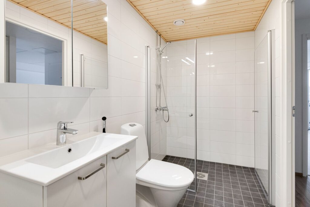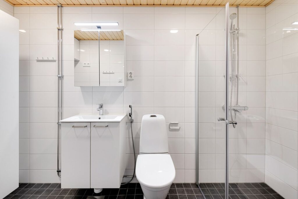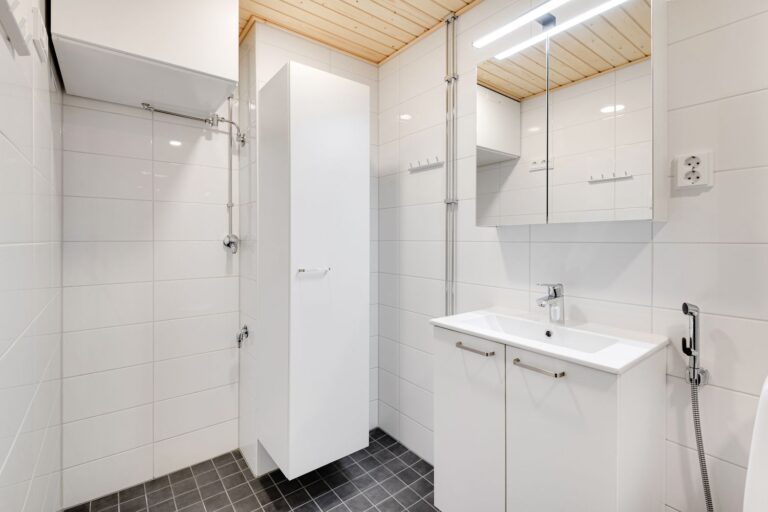 Kylpyhuoneen seinät on laatoitettu ja lattioissa on keraaminen laatta. Suihkussa on näppärästi kääntyvä suihkuseinä. Lisäksi kylpyhuoneessa on peilikaappi, jossa on pistorasia ja valaisin, allaskaappi pesualtaiden alla sekä liitos- ja tilavaraukset pyykinpesukoneelle tai pesutornille.
