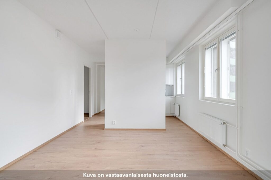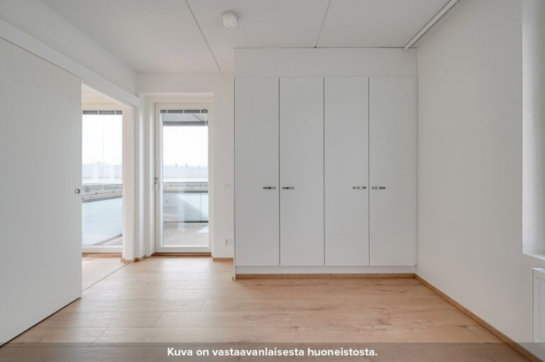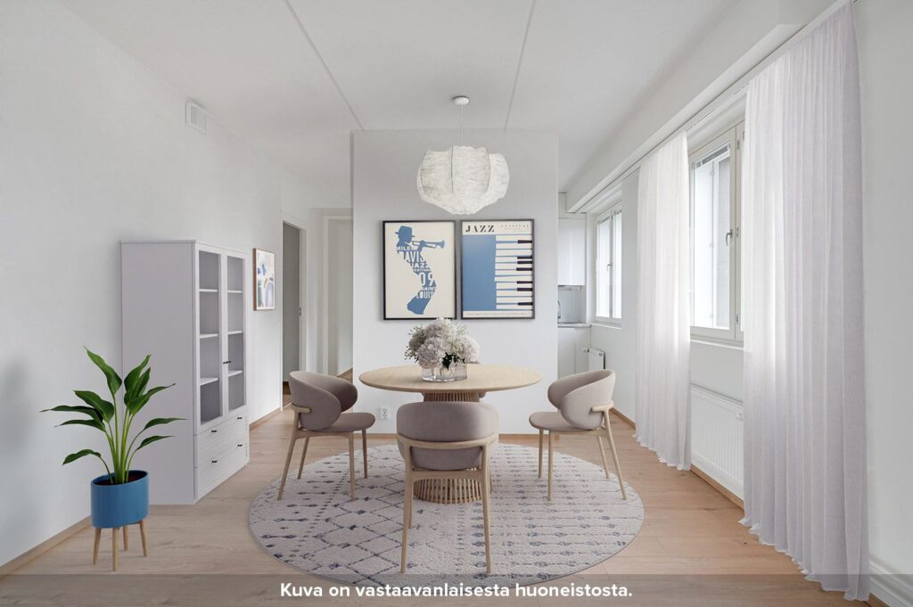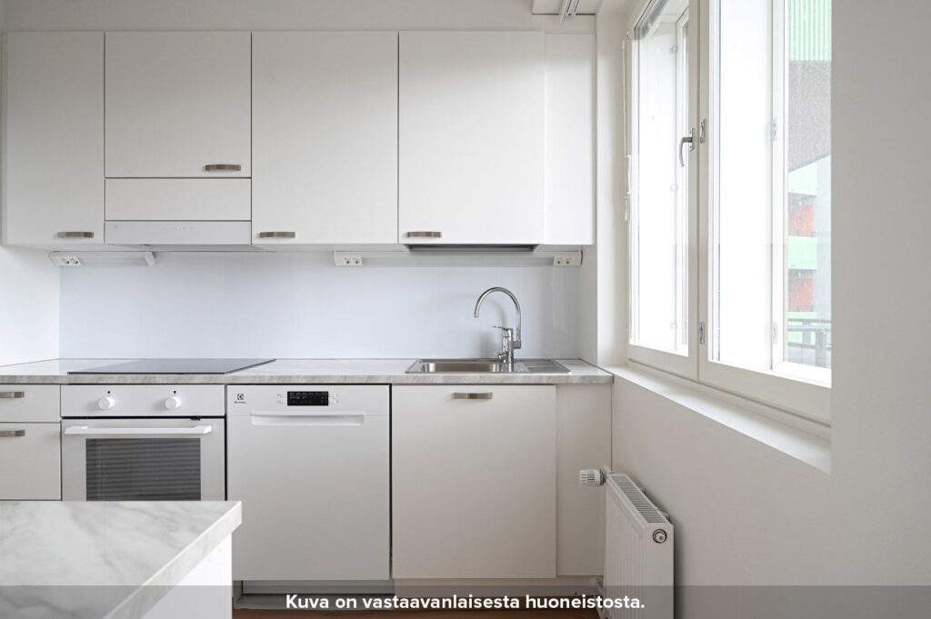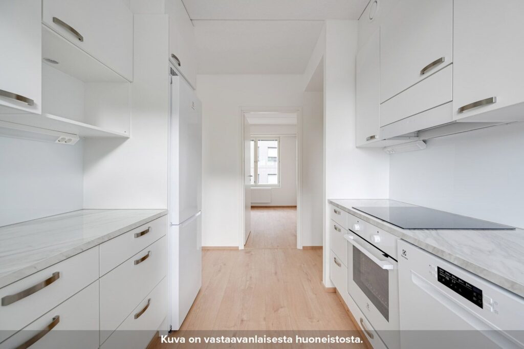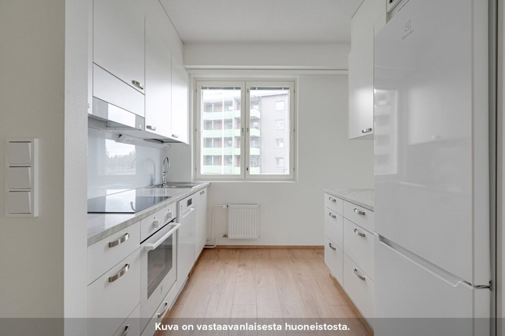 Tilava perheasunto toimivalla pohjaratkaisulla neljännessä kerroksessa. Asuntoon astutaan sisään oman kuistin kautta ja erillinen eteiskäytävä johdattelee asuntoon. Keittiö ja olohuone on sijoitettu yhteen toimivaan tilaan, jossa ajanvietto perheen kanssa on helppoa. Keittiössä ala- ja yläkaappien väliset taustaseinät ovat levypintaisia. Keittiön työpöytätasot ovat laminaattia ja allas puolestaan ruostumatonta terästä. Keittiössä on lisäksi induktiokeittotasolla varustettu kalusteuuni, astianpesukone sekä tilavaraus mikroaaltouunille.