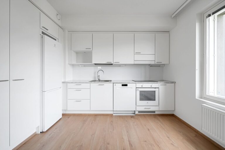Erillinen eteiskäytävä johdattelee sisään tähän viihtyisään asuntoon, jossa on tilava kulmakeittiö. Keittiössä ala- ja yläkaappien väliset taustaseinät ovat levypintaisia, työpöytätasot laminaattia ja allas puolestaan ruostumatonta terästä. Keittiössä on lisäksi induktiokeittotasolla varustettu kalusteuuni, astianpesukone sekä tilavaraus mikroaaltouunille.
