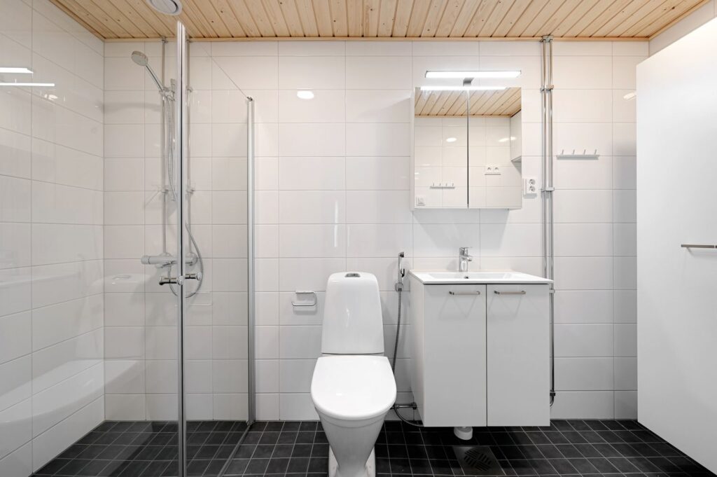 Kylpyhuone löytyy asunnon eteisen yhteydestä. Kylpyhuoneen seinät on laatoitettu ja lattioissa on keraaminen laatta. Suihkussa on näppärästi kääntyvä suihkuseinä. Lisäksi kylpyhuoneessa on peilikaappi, jossa on pistorasia ja valaisin, allaskaappi pesualtaiden alla sekä liitos- ja tilavaraukset pyykinpesukoneelle tai pesutornille.