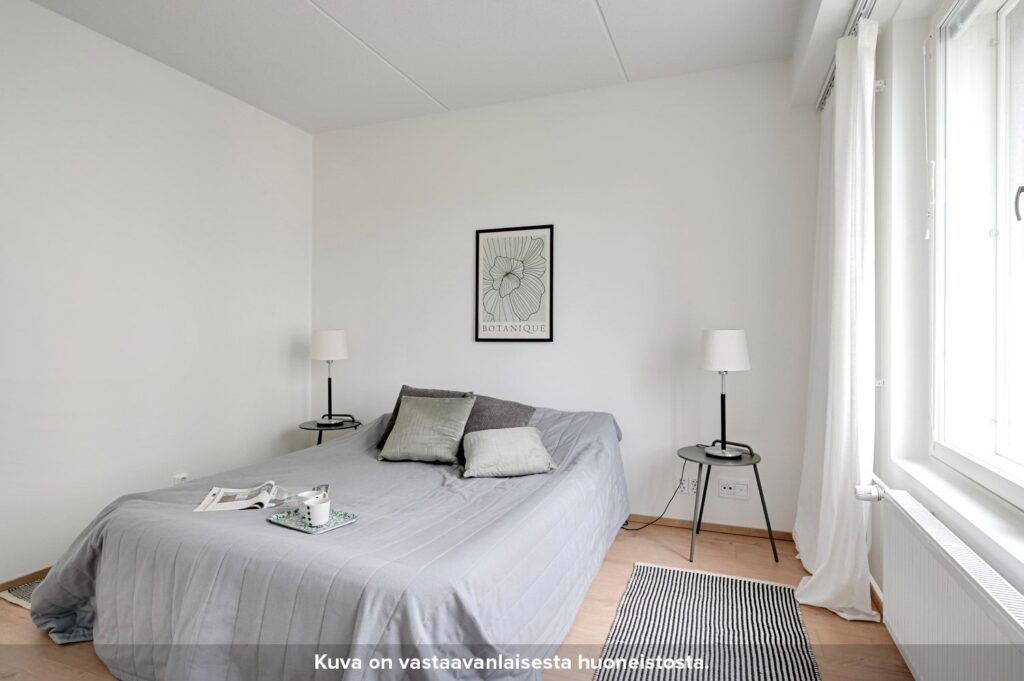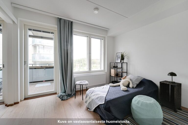 Asunnossa on kaksi tilavaa makuuhuonetta, joissa on kaappitilaa. Asunnon kompaktille lasitetulle parvekkeelle pääsee kulkemaan niin olohuoneesta kuin toisesta makuuhuoneestakin. Kylpyhuone löytyy eteisen yhteydestä. Kylpyhuoneen seinät on laatoitettu ja lattioissa on keraaminen laatta. Suihkussa on näppärästi kääntyvä suihkuseinä. Lisäksi kylpyhuoneessa on peilikaappi, jossa on pistorasia ja valaisin, allaskaappi pesualtaiden alla sekä liitos- ja tilavaraukset pyykinpesukoneelle tai pesutornille.