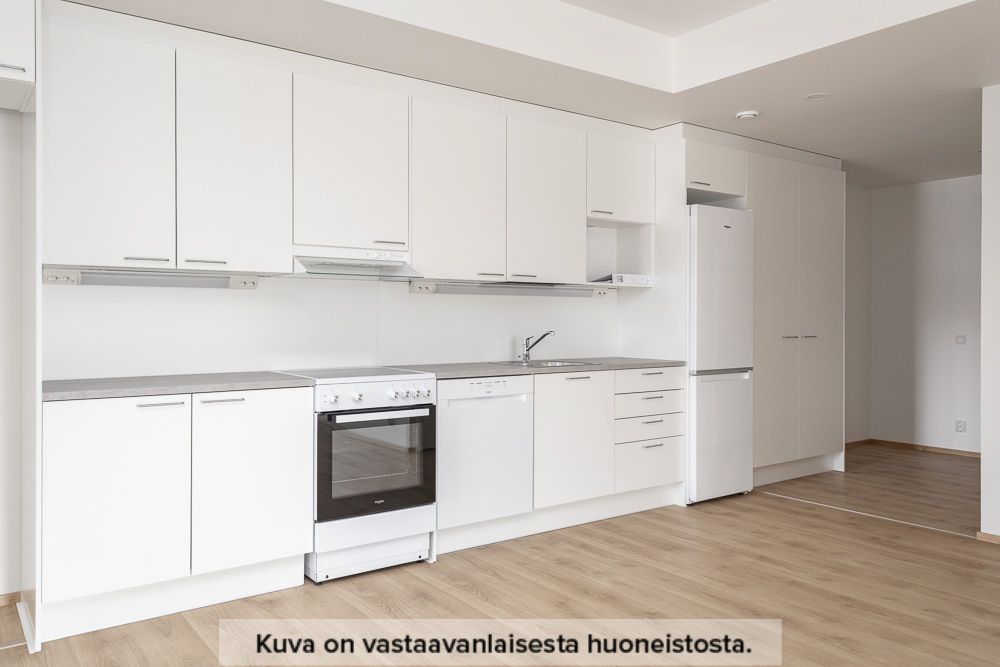 Keittiön varustukseen kuuluu valkoinen lattialiesi uunilla, täyskorkea jääkaappi-pakastin yhdistelmä, astianpesukone sekä tilavaraus mikrolle. Neljän huoneen asunnoissa on myös varaus toiselle kylmälaitteelle. Pesuhuoneesta löytyy tilavaraus ja liitännät pyykinpesukoneelle sekä kuivausrummulle.