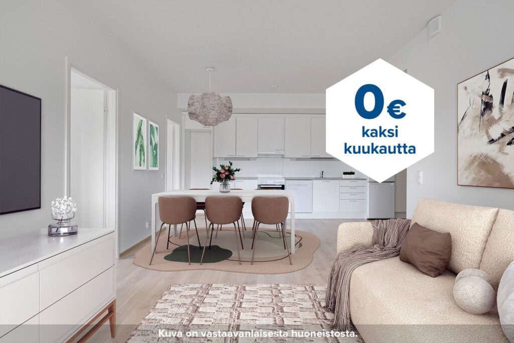 Tee sopimus nyt – saat kahden ensimmäisen kuukauden käyttövastikkeen hintaan 0 € ja vakuusmaksun 250 €. Edut ovat voimassa 15.4.2026 saakka ja koskevat vain vapaita asuntoja ja uusia asiakkaita. Vesi- ja autopaikkamaksut normaalisti. Edellyttää 12 kuukauden asumista.