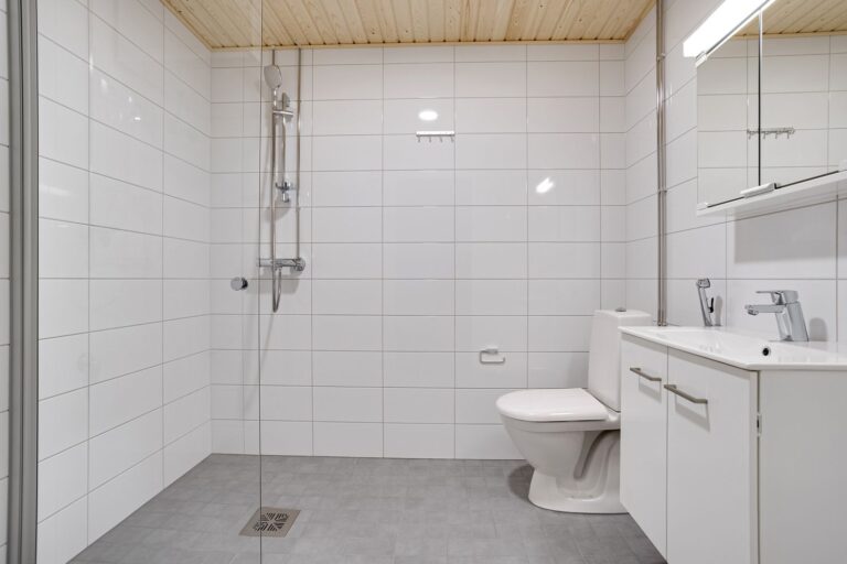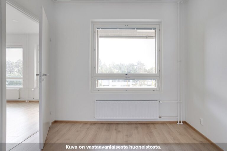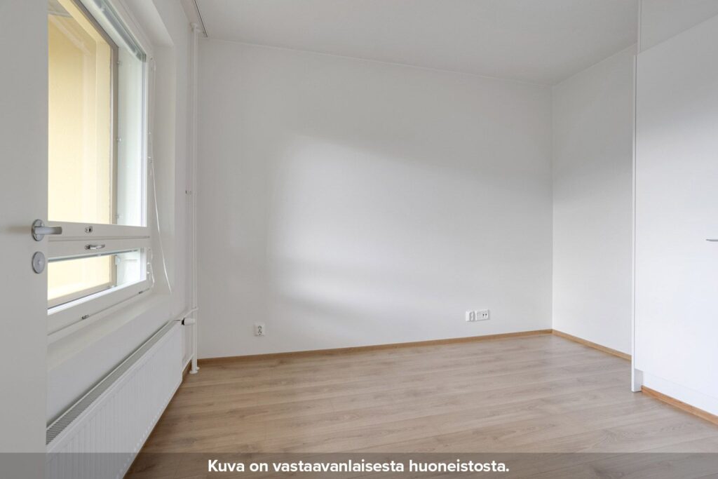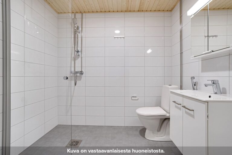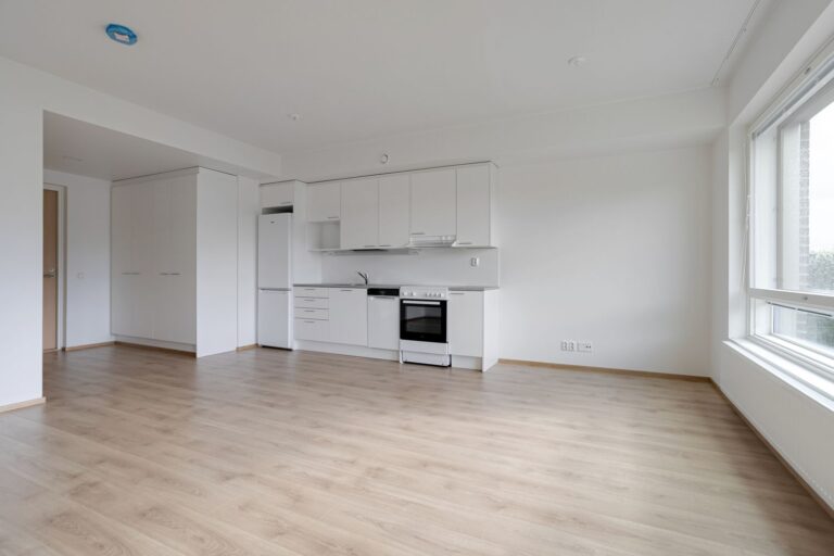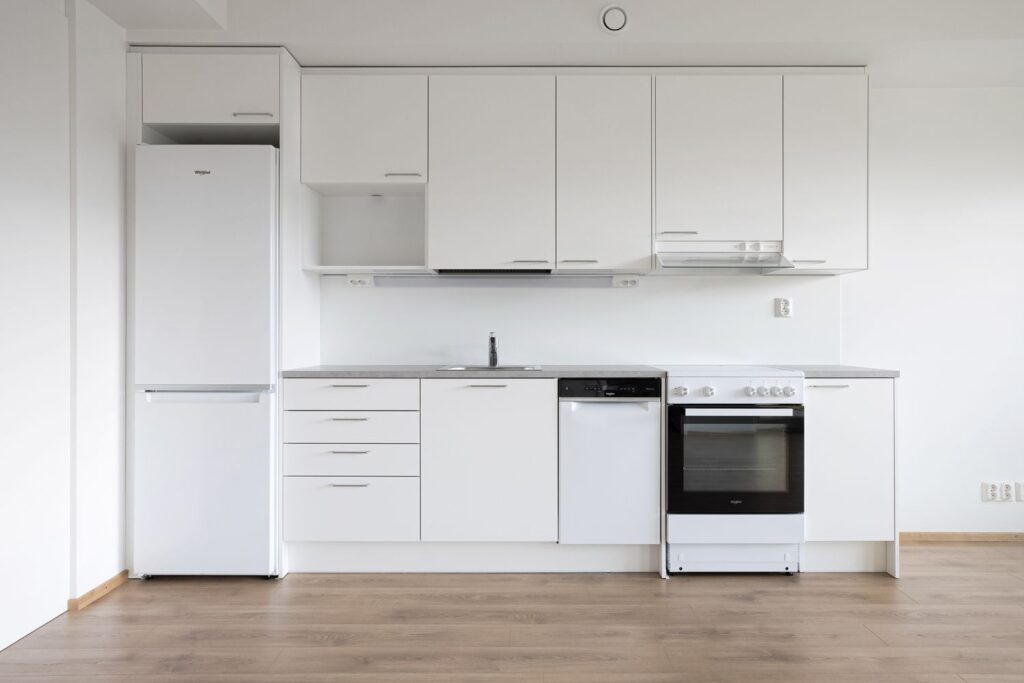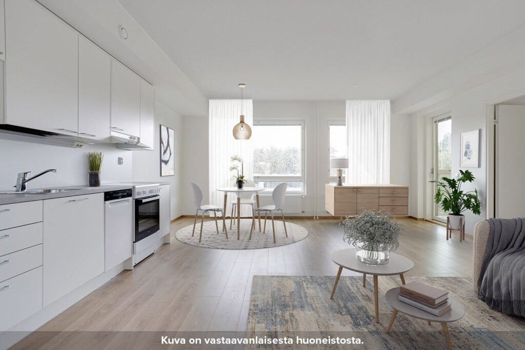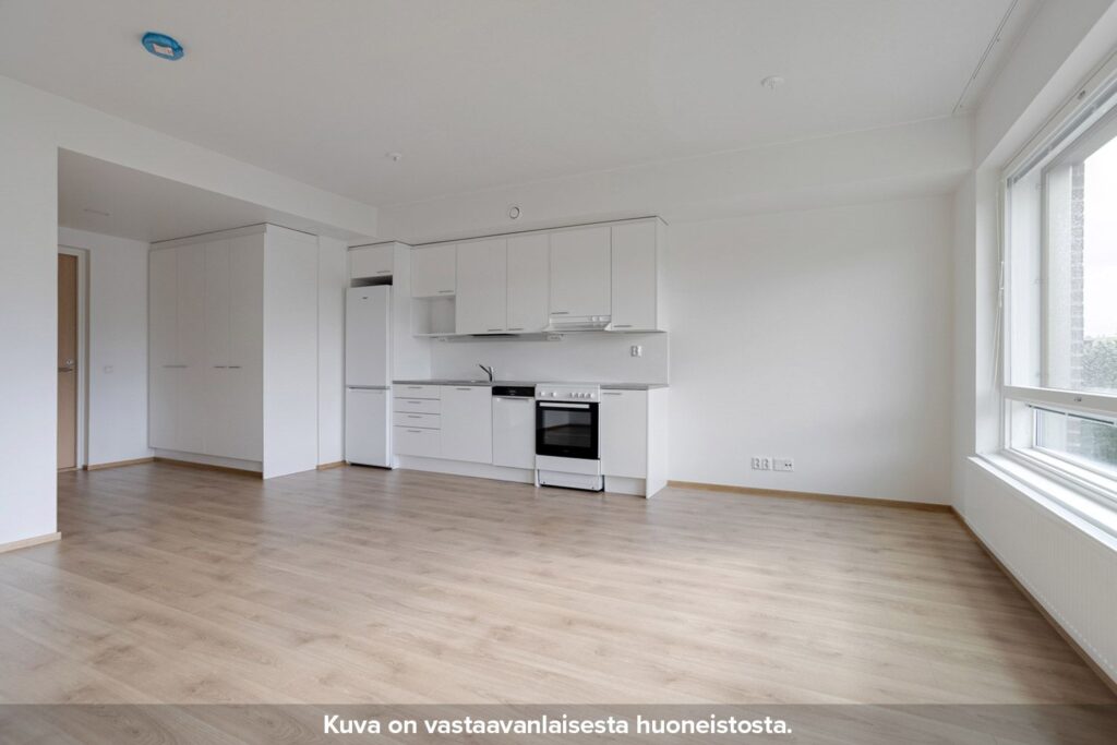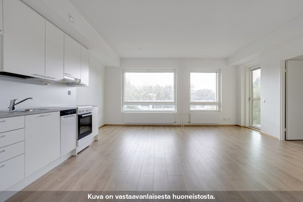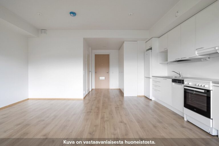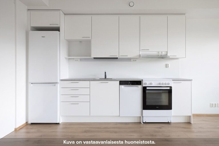 Neutraalinsävyiset pintamateriaalit toimivat hyvänä pohjana omannäköiselle sisustukselle. Keittiön varustukseen kuuluu valkoinen lattialiesi uunilla, täyskorkea jääkaappi-pakastin yhdistelmä, astianpesukone sekä tilavaraus mikrolle. Pesuhuoneesta löytyy tilavaraus ja liitännät pyykinpesukoneelle sekä kuivausrummulle.