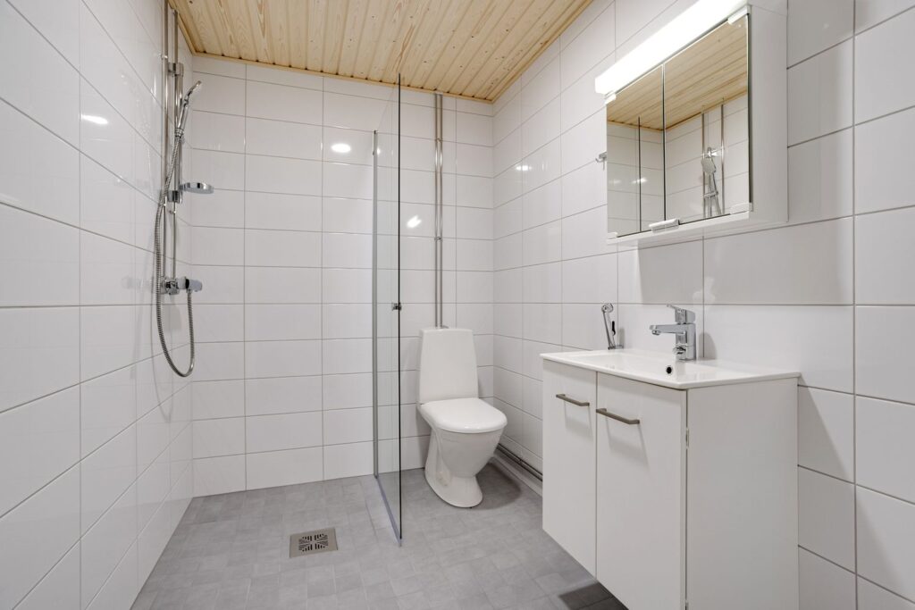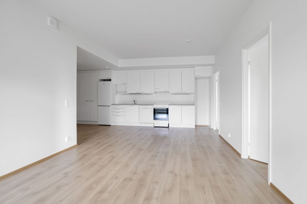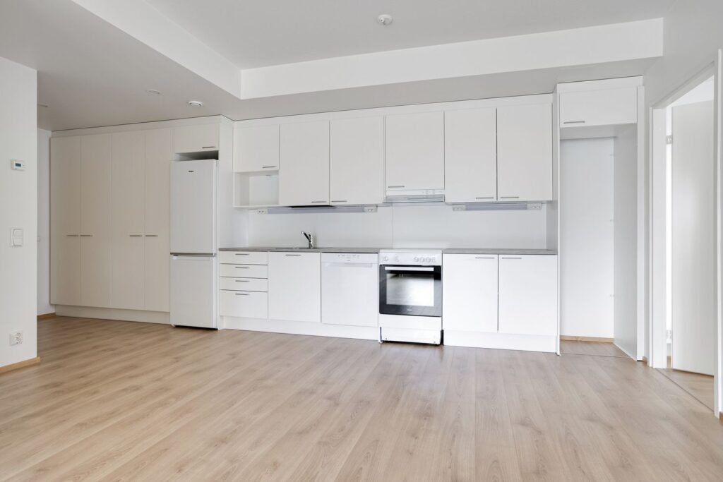Neutraalinsävyiset pintamateriaalit toimivat hyvänä pohjana omannäköiselle sisustukselle. Keittiön varustukseen kuuluu valkoinen lattialiesi uunilla, täyskorkea jääkaappi-pakastin yhdistelmä, astianpesukone sekä tilavaraus mikrolle. Neljän huoneen asunnoissa on myös varaus toiselle kylmälaitteelle. Pesuhuoneesta löytyy tilavaraus ja liitännät pyykinpesukoneelle sekä kuivausrummulle.
