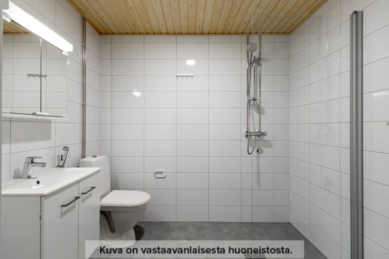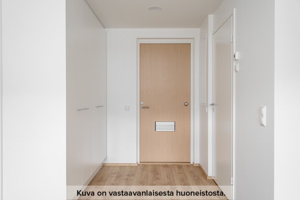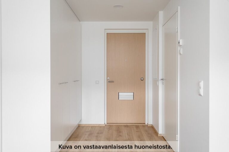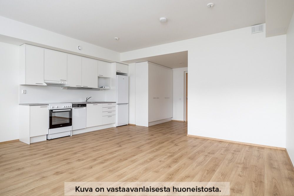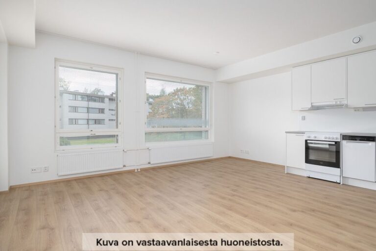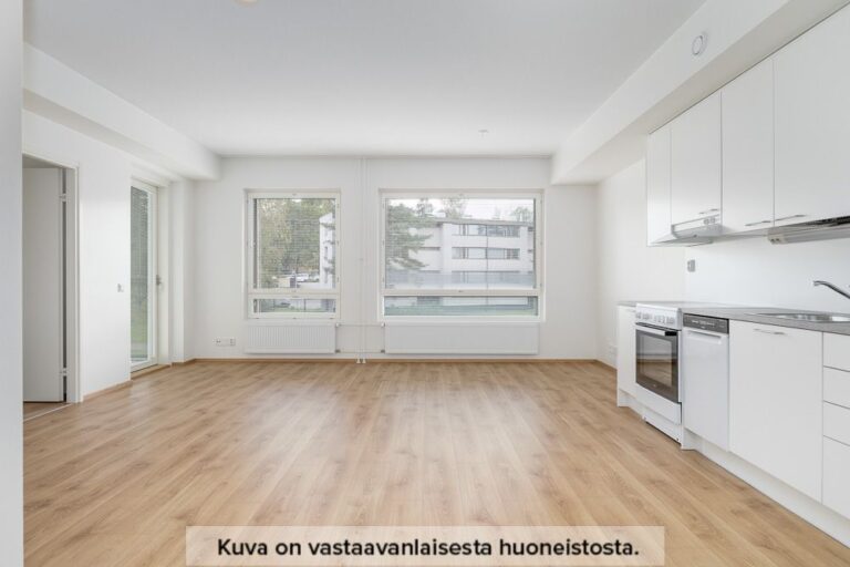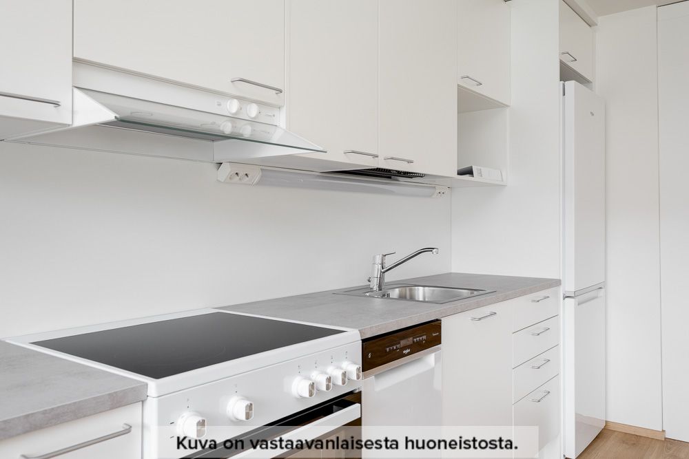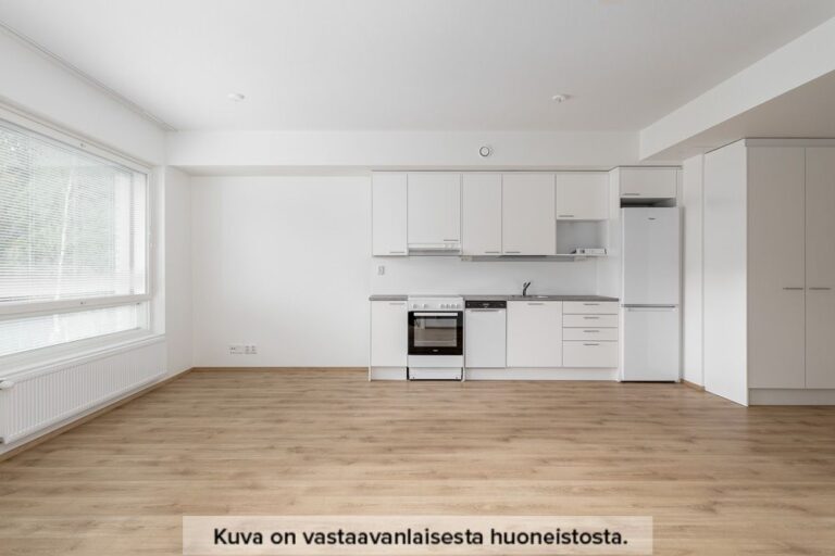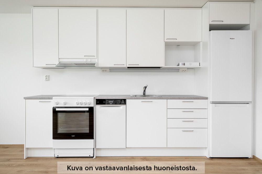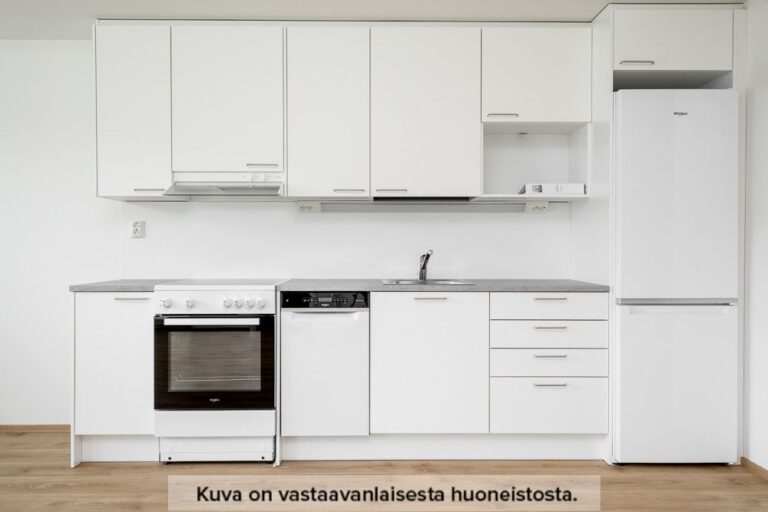 Neutraalinsävyiset pintamateriaalit toimivat hyvänä pohjana omannäköiselle sisustukselle. Keittiön varustukseen kuuluu valkoinen lattialiesi uunilla, täyskorkea jääkaappi-pakastin yhdistelmä, astianpesukone sekä tilavaraus mikrolle. Pesuhuoneesta löytyy tilavaraus ja liitännät pyykinpesukoneelle sekä kuivausrummulle.