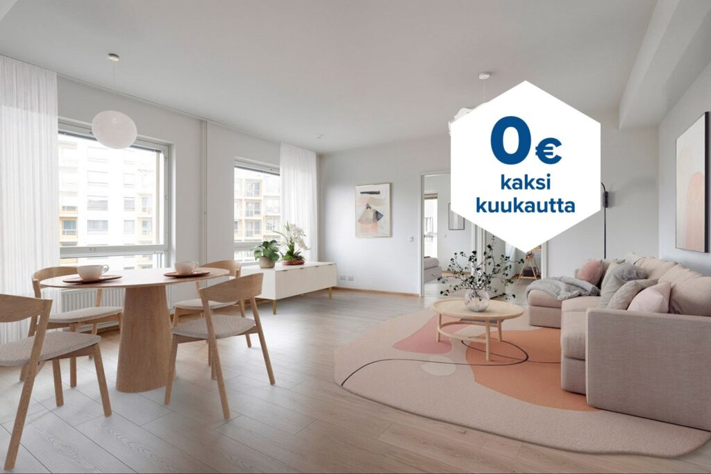 Tee sopimus nyt – saat kahden ensimmäisen kuukauden käyttövastikkeen hintaan 0 € ja vakuusmaksun 250 €. Edut ovat voimassa 15.4.2026 saakka ja koskevat vain vapaita asuntoja ja uusia asiakkaita. Vesi- ja autopaikkamaksut normaalisti. Edellyttää 12 kuukauden asumista.
