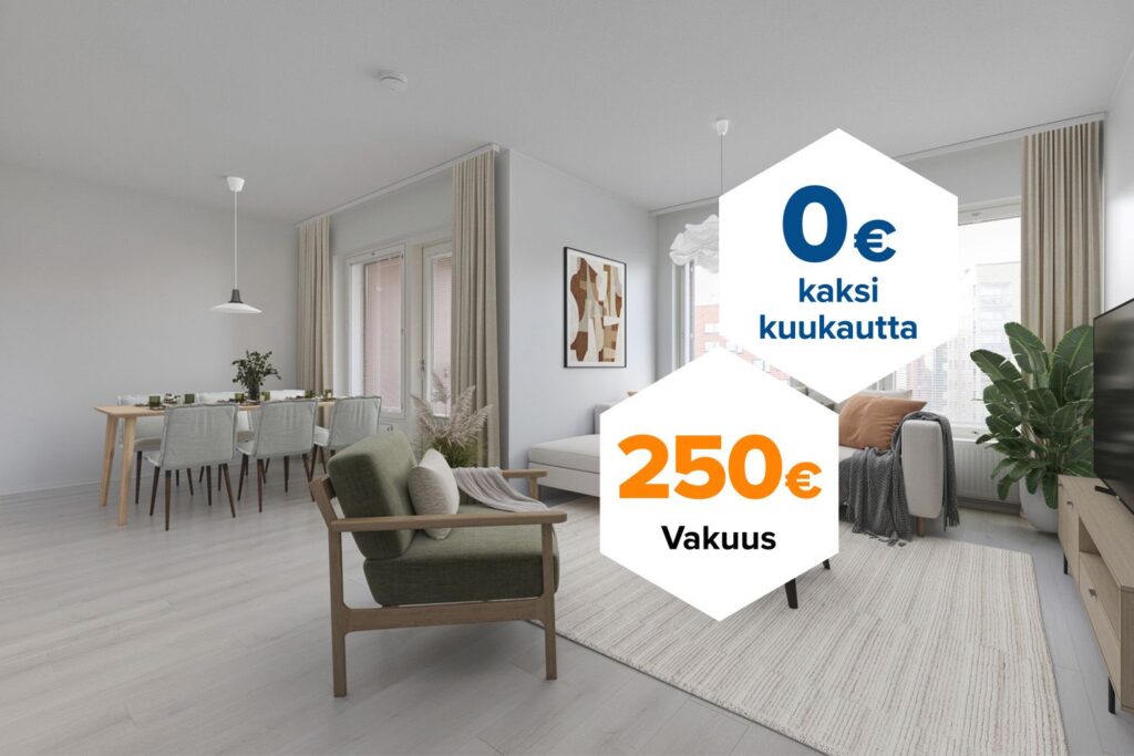 Tee sopimus nyt – saat kahden ensimmäisen kuukauden käyttövastikkeet hintaan 0 € ja vakuusmaksun 250 €. Etu voimassa 15.4.2026 saakka ja koskee vain uusia asiakkaita. Vesi- ja autopaikkamaksut normaalisti. Edellyttää 12 kk asumista.