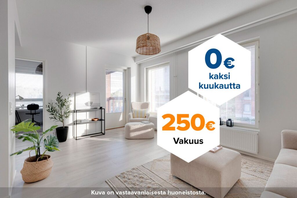 Tee sopimus nyt – saat kahden ensimmäisen kuukauden käyttövastikkeet hintaan 0 € ja vakuusmaksun 250 €. Etu voimassa 15.4.2026 saakka ja koskee vain uusia asiakkaita. Vesi- ja autopaikkamaksut normaalisti. Edellyttää 12 kk asumista.