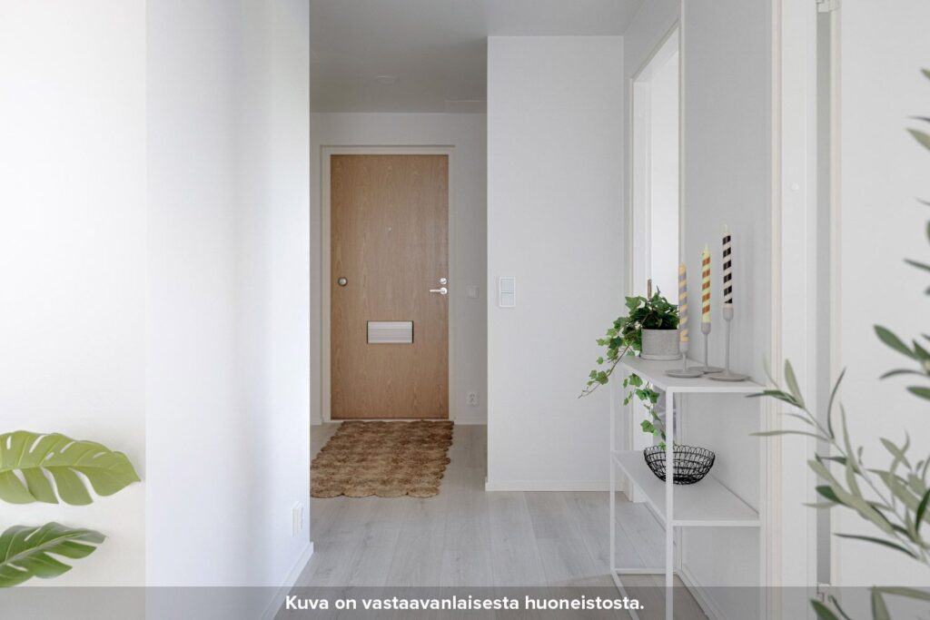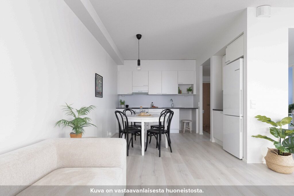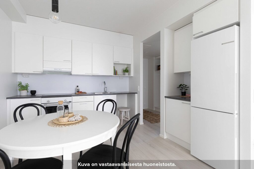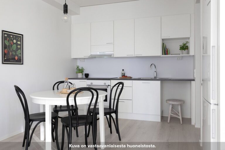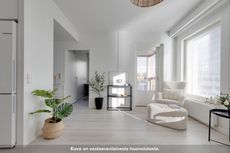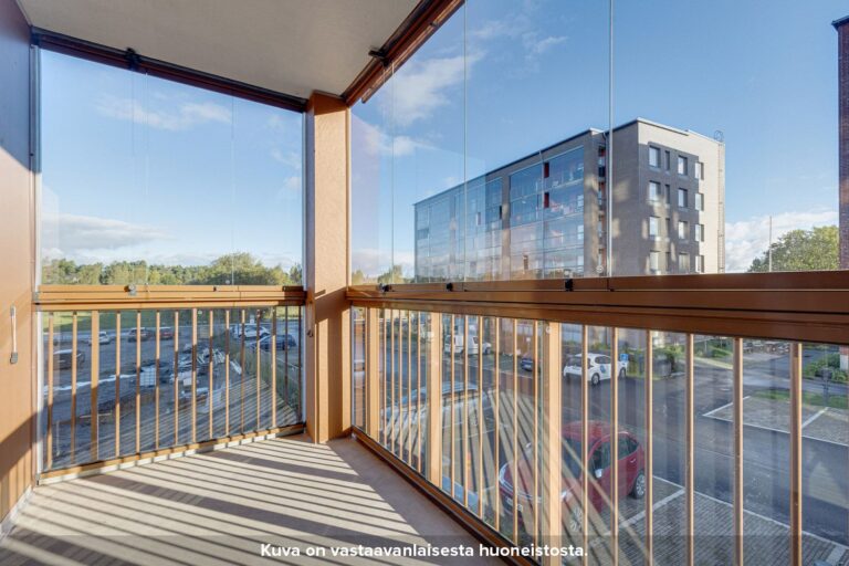 Tässä asunnossa on avara keittiö ja olohuone, josta käynti omalle lasitetulle parvekkeelle. Asunnossa on tilavat makuuhuoneet ja kylpyhuone, jossa tilavaraus pesutornille. Tämä huoneisto sopii täydellisesti niin perheille kuin pariskunnille, jotka arvostavat selkeyttä ja tehokasta tilankäyttöä. Sisäkuvat ovat kohteen toisesta vastaavanlaisesta asunnosta.