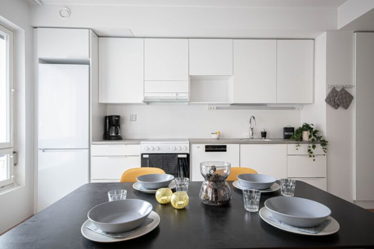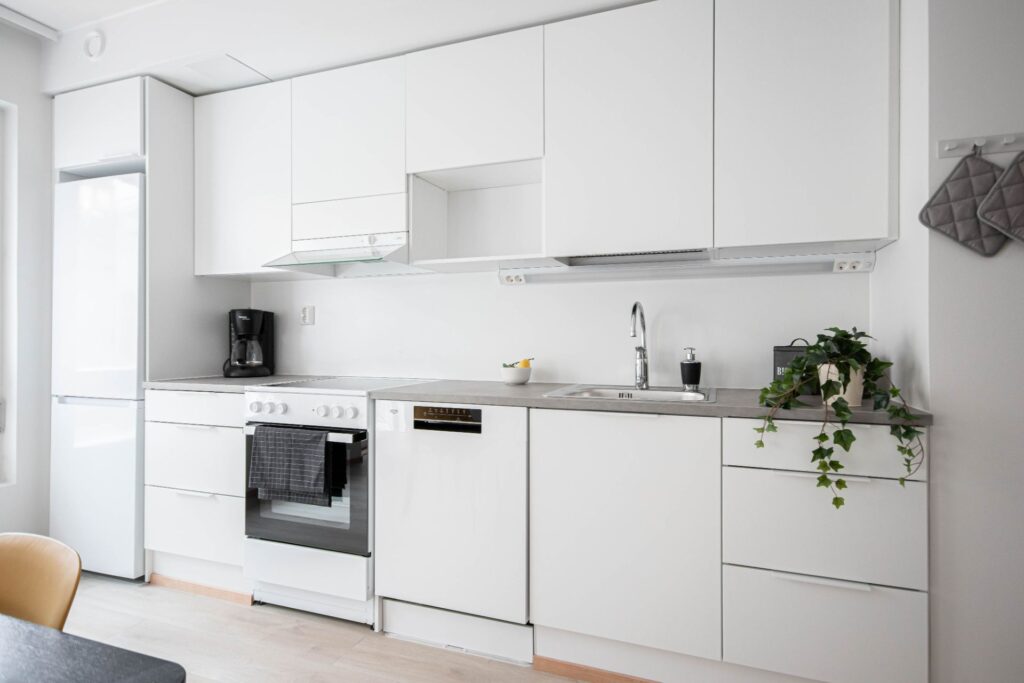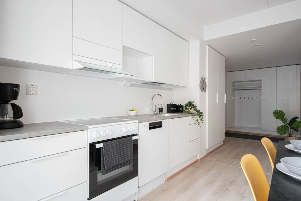 Tähän kulmahuoneistoon tulee valoa kahdesta ilmansuunnasta. Keittiö ja olohuone ovat yhtenäistä avaraa tilaa, jossa keittiö on yhdellä seinustalla. Keittiössä on valmiina astianpesukone.