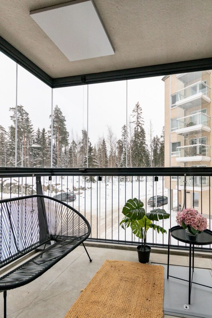 Saunallinen toisen kerroksen kaksio, jossa on lasitettu parveke olohuoneen yhteydessä. Kulmahuoneisto, johon tulee valoa kahdesta ilmansuunnasta. Keittiö ja olohuone ovat yhtenäistä avaraa tilaa. Keittiössä on astianpesukone, jääkaappipakastin, keraaminen liesi sekä tilavaraus mikrolle. Makuuhuoneeseen kuljetaan liukuovien kautta, ja siellä on mukavasti kaappitilaa. Kylpyhuoneessa on oma sauna sekä tilavaraus pyykinpesukoneelle ja pesutornille. Asuintilojen lattiat ovat laminaattia, ja kylpyhuone on laatoitettu.