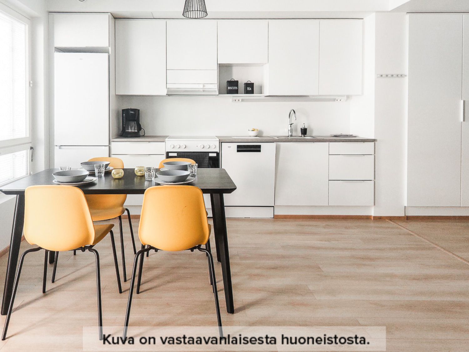 Tähän neljännen kerroksen kulmahuoneistoon tulee valoa kahdesta ilmansuunnasta. Keittiö ja olohuone ovat yhtenäistä avaraa tilaa, jossa keittiö on yhdellä seinustalla. Keittiössä on valmiina astianpesukone, jääkaappipakastin, keraaminen liesi sekä tilavaraus mikrolle.