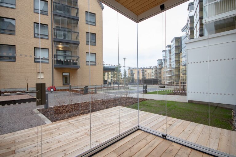 Uusi saunallinen ensimmäisen kerroksen mukavankokoinen kaksio, jossa on osittain lasitettu terassi