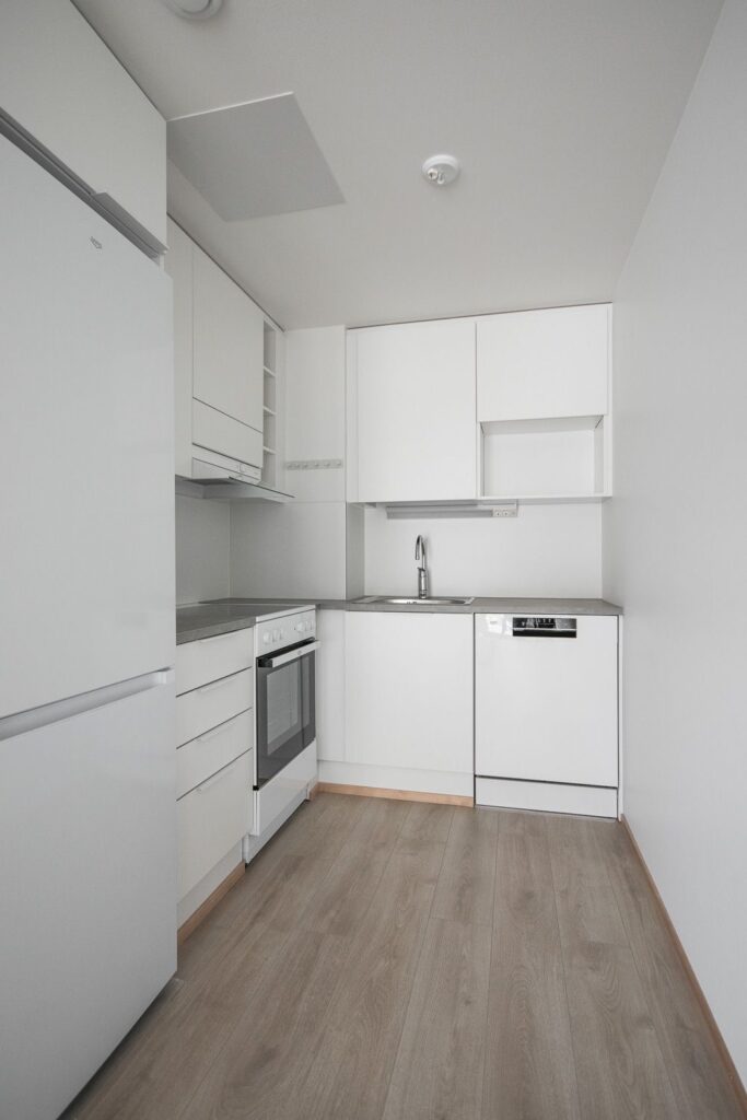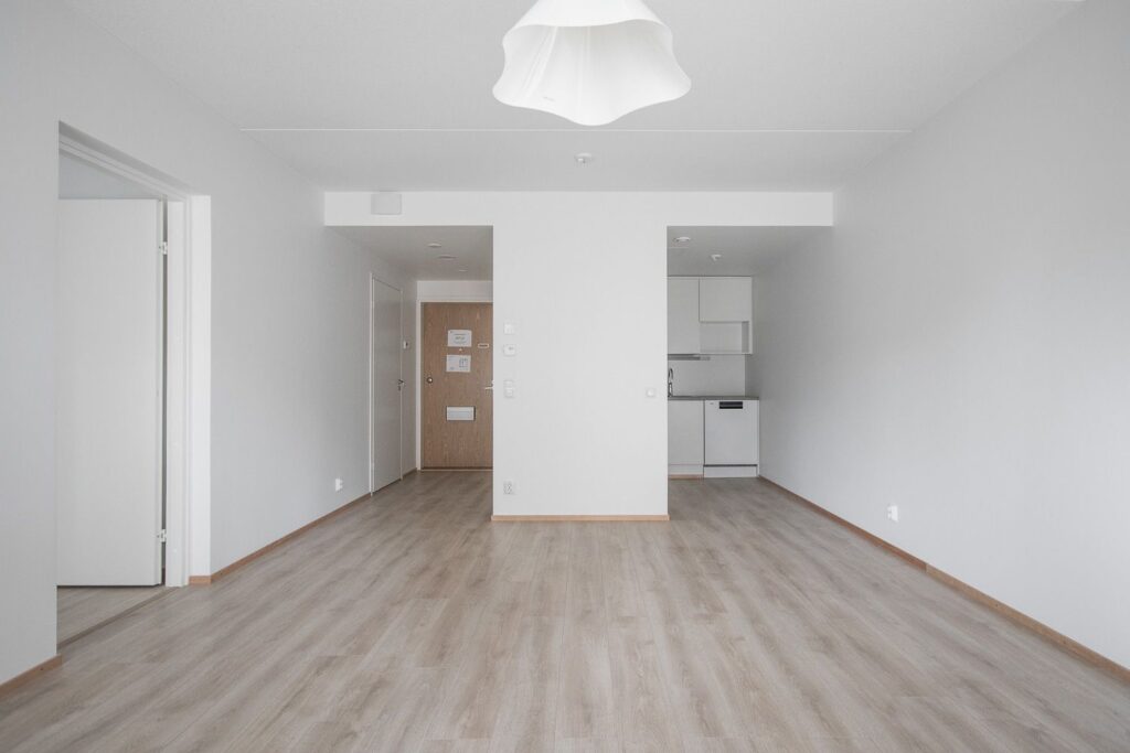 Tämä selkeäpohjainen asunto on helppo sisustaa mieleisekseen. Keittiö on olohuoneen yhteydessä omassa kulmauksessaan, ja siellä on jääkaappipakastin, keraaminen liesi, astianpesukone sekä tilavaraus mikrolle. Kylpyhuoneessa on oma sauna sekä tilavaraus pyykinpesukoneelle ja pesutornille. Asuintilojen lattiat ovat laminaattia, ja kylpyhuone sekä erillinen wc on laatoitettu.