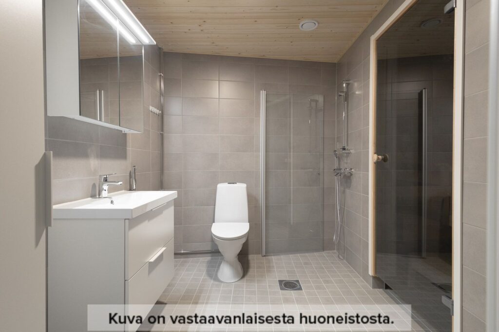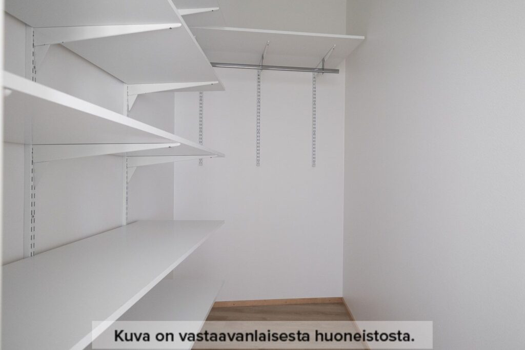 Kolmannen kerroksen tilava saunallinen kolmio, jossa on lasitettu parveke. Läpitalon asunnossa on avara pohjaratkaisu, ja valoa tulee kahdesta ilmansuunnasta. Keittiö ja olohuone ovat yhtenäistä tilaa, ja keittiössä on valmiina astianpesukone. Toisen makuuhuoneen yhteydessä on vaatehuone, toisessa kaapistot. Asuintilojen lattiat ovat laminaattia, ja kylpyhuone on laatoitettu. Kylpyhuoneessa on tilavaraus pyykinpesukoneelle ja pesutornille.