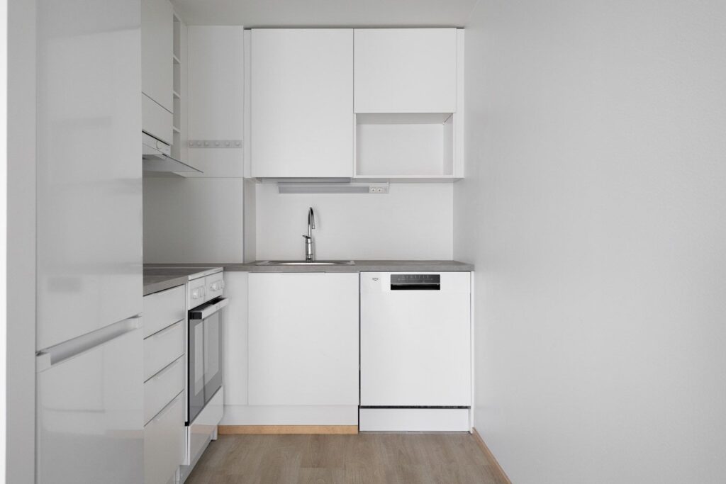 UUDISKOHDE. Viehättävä kuudennen kerroksen pieni kaksio hurmaa lasitetulla parvekkeellaan ja kätevällä vaatehuoneellaan. Keittiö on olohuoneen yhteydessä omassa kulmauksessaan ja avautuu olohuoneeseen. Keittiö on varustettu kaikilla mukavuuksilla – astianpesukone, jääkaappipakastin, keraaminen liesi ja paikka mikrolle löytyvät valmiina.