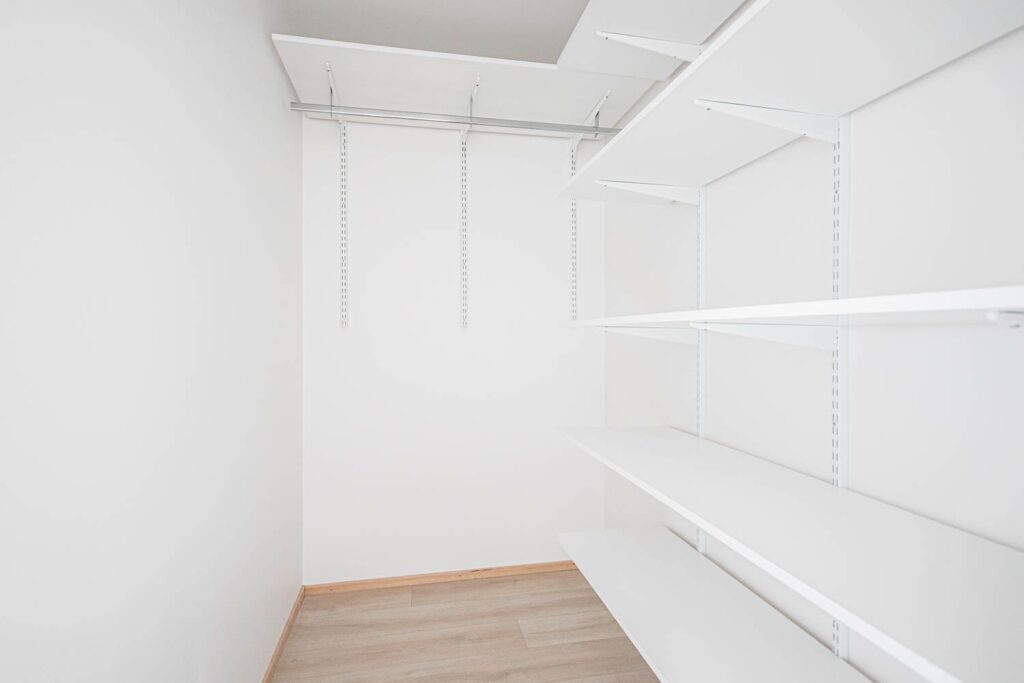 · Kaksi makuuhuonetta: toisessa tilava vaatehuone, toisessa käytännölliset kaapistot
