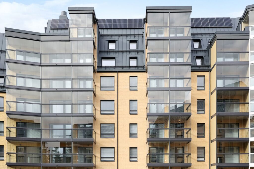 Tässä ylimmän kerroksen asunnossa on huoneistokohtainen ilmanvaihtolaite ja viilennys. Voit säätää ilmanvaihdon tehokkuutta sekä viilennyksen lämpötilaa ja tehoa asunnossa olevasta säätimestä.
